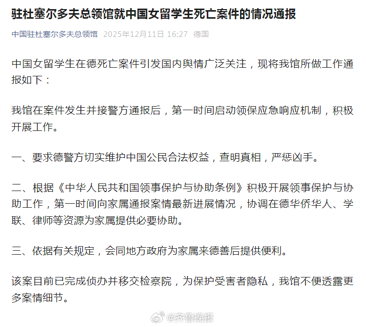 【#我领馆通报中国女留学生在德死亡#】中国女留学生在德死亡案件引发国内舆情广泛关注,现将我馆所做工作通报如下:我馆在案件发生并接警方通报后,第一时间启动领保应急响应机制,积极开展工作。一、要求德警方切实维护中国公民合法权益,查明真相,严惩凶手。二、根据《中华人民共和国领事保护与协助条例》积极开展领事保护与协助工作,第一时间向家属通报案情最新进展情况,协调在德华侨华人、学联、律师等资源为家属提供必要协助。三、依据有关规定,会同地方政府为家属来德善后提供便利。该案目前已完成侦办并移交检察院,为保护受害者隐私,我馆不便透露更多案情细节。(“中国驻杜塞尔多夫总领馆”微信公号)