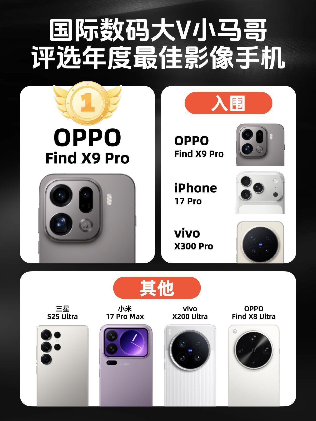 去年iPhone16 Pro拿的大奖,今年被国产机抢了… 刚看了油管顶流数码博主MKBHD公布的年度手机奖项,感觉今年评选的结果确实有点“风水轮流转”的意思。 去年拿下年度最佳影像手机的,是iPhone 16 Pro;📸没想到今年却被国产旗舰OPPO Find X9 Pro拿下了~ 要知道今年入围的是iPhone17 Pro、vivo X300 Pro这些影像旗舰,甚至还有年初各家的Ultra级机型👍每台都是各家堆料堆到顶的机型, 但Find X9 Pro却依旧让MKBHD给出了“它的相机几乎无可挑剔”的评价,含金量还是相当足的。 不过,这也不难理解,这代Find X9 Pro的影像堆料是真的猛。💪主摄直接怼上了哈苏真2亿像素,🔍细节拉满,特别是在暗光和高动态场景下,解析力明显拉开差距。 而且影像整体一致性做得很强。很多顶级旗舰拍照“主摄强、副摄弱”,但Find X9 Pro的几颗镜头都没啥可挑剔的,再加上还有丹霞色彩还原镜头,让色彩还原更精准,❌不容易出现偏色的问题,拍人、拍景都更真实。MKBHD一直很看重“准确性”,这点完全打到他的审美点上。🎯 MKBHD年度奖 OPPOFindX9Pro 最佳影像手机 数码风向标 OPPO 国产手机iPhone16Pro