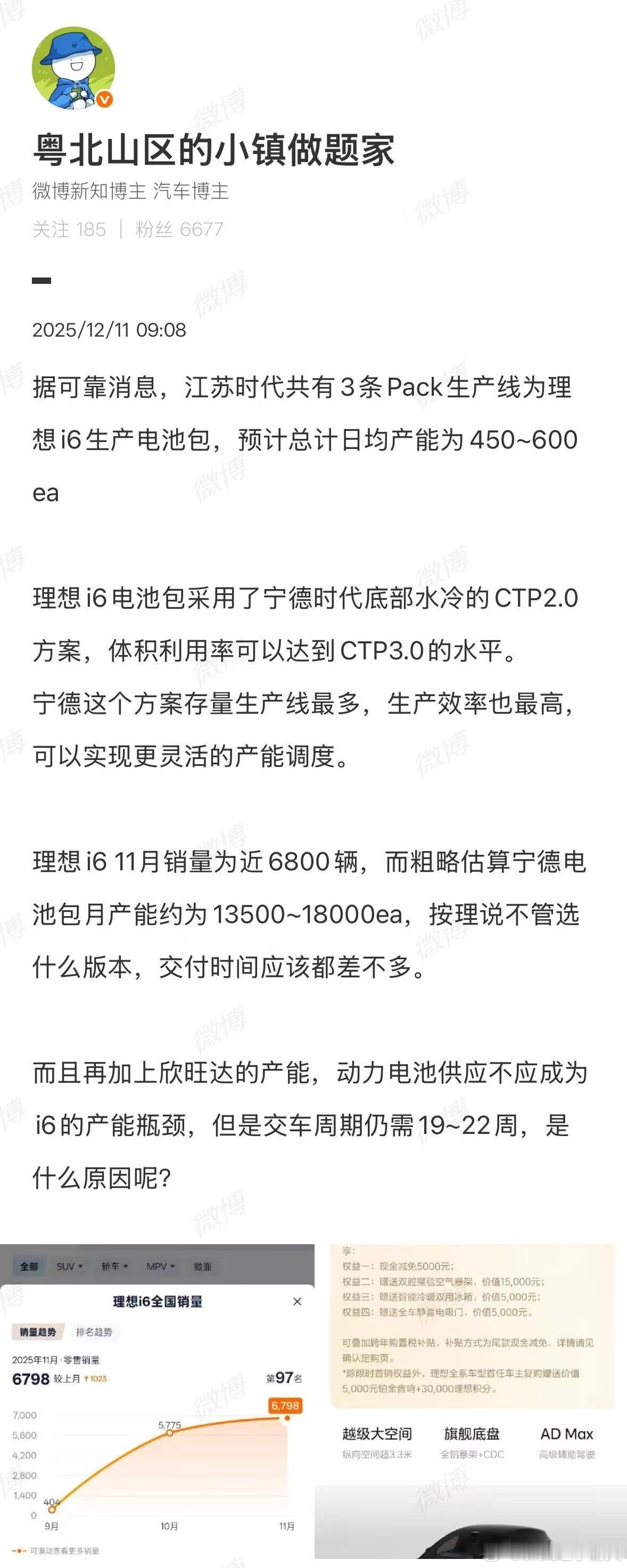 理想 i6 的宁德电池到底有没有供应瓶颈?我们找理想的同学求证了一下,得到的回复是:神行电池产能充足,不代表 i6 电池包产能充足。他还给了个生动的类比:老家三套房,不代表北京随便住。所以,不管怎么样,想早日提车的,换欣旺达确实就可以加速提车理想汽车理想i6