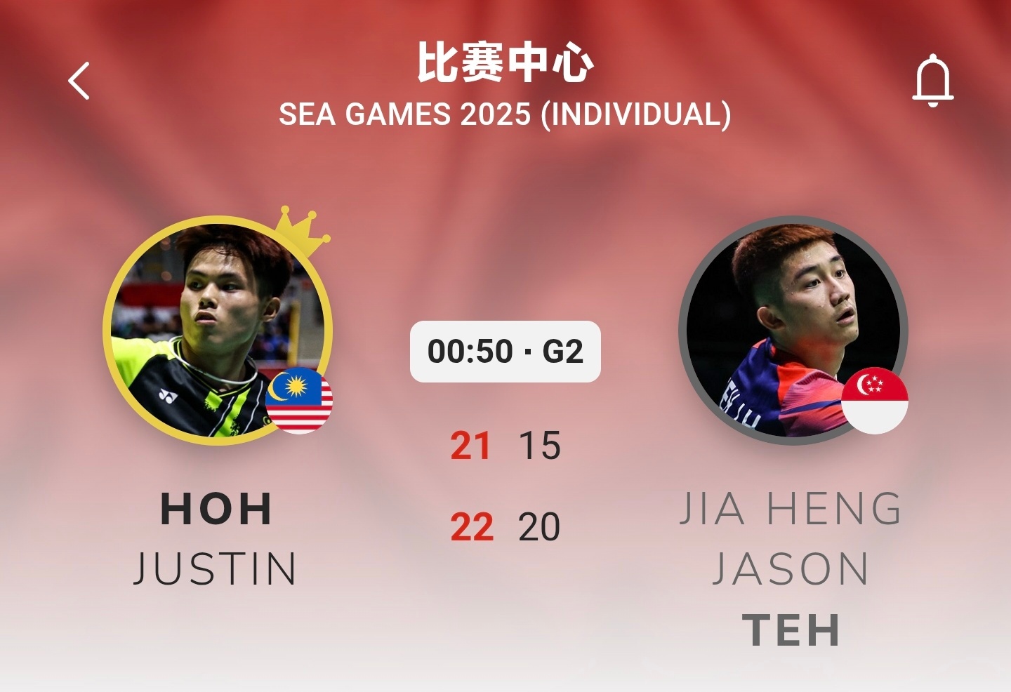 男单16进8:贺首维🇲🇾 21-15、22-20 🇸🇬郑加恒2025东南亚运动会
