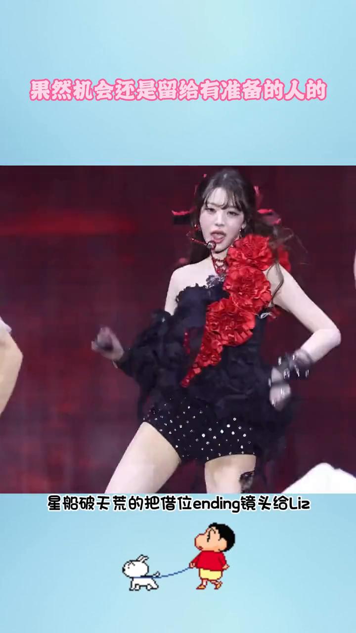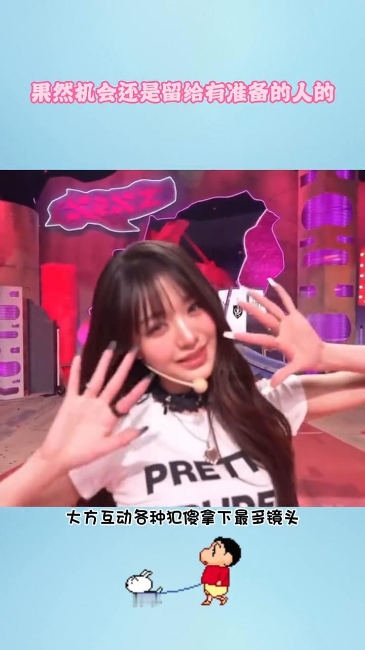 怪不得星船老给张元英那么多镜头。新歌打歌结束,星船破天荒的把借位ending镜头给Liz,结果Liz憋不住笑场害羞跑开了,最后还是张元英出来救场。张元英一看就是有备而来的,他真的美而自知,大方互动各种犯傻拿下最多镜头,果然机会还是留给有准备的人的。