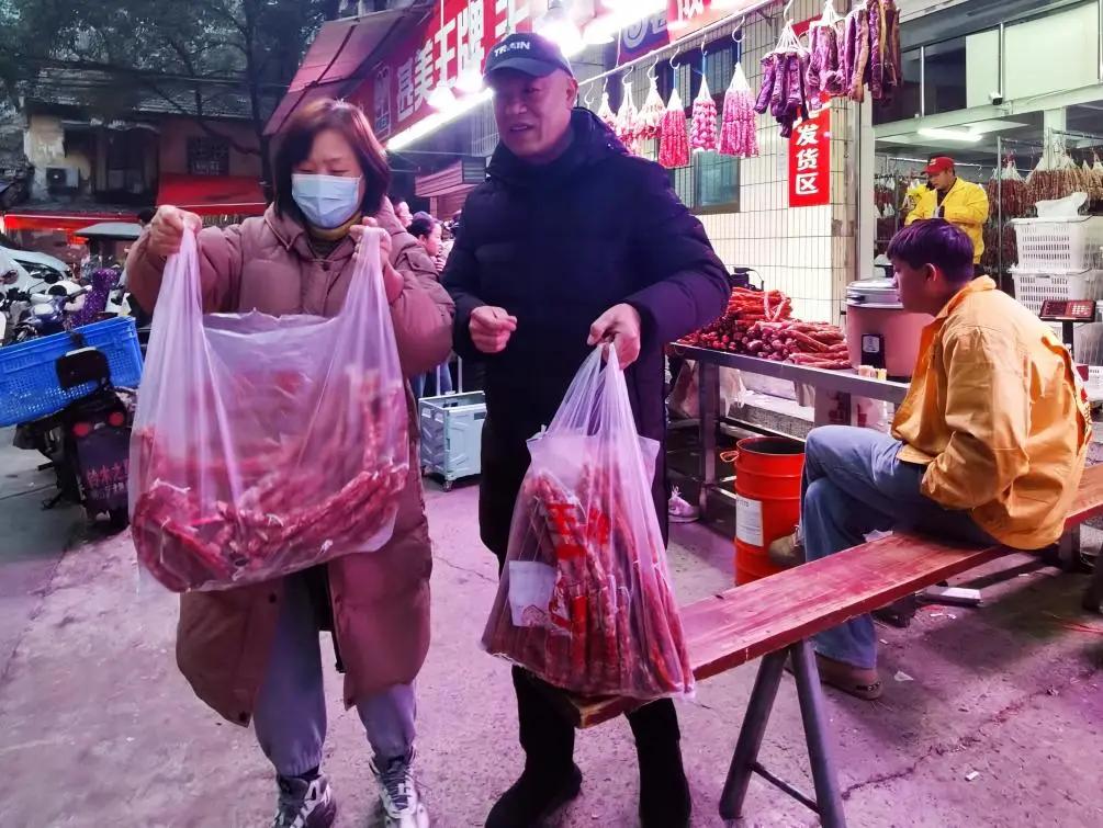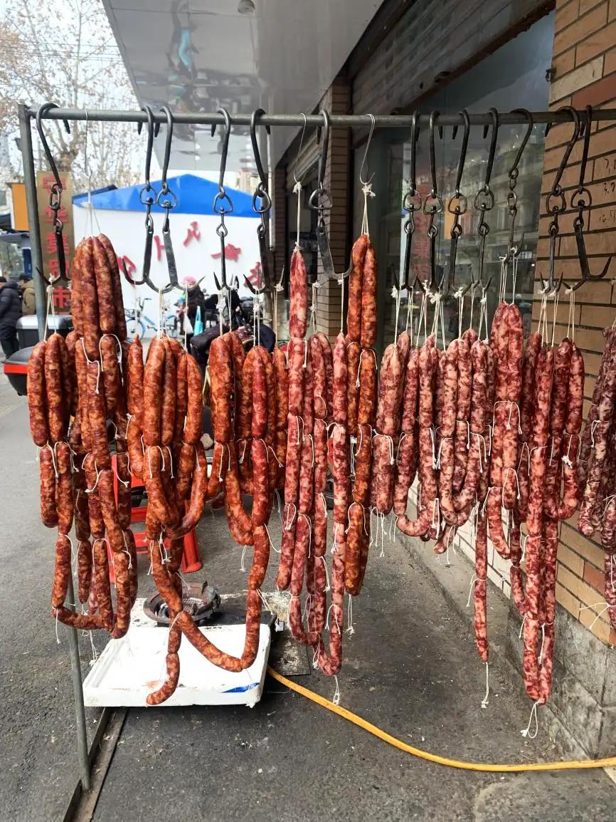 今天头脑一热就把香肠灌了。然后就刷到头条里有人说,最近气温太高,灌好的香肠都晒酸晒黏了,蒸了尝尝,味都不对了,最后只好扔了。看到这消息后愁的我晚上都失眠了。 我原本想好过几天,等温度降下来再去灌香肠。前天去菜场问了价,白猪肉12一斤,加上加工佐料费,灌一斤香肠15块,黑猪肉15一斤,加上加工费一斤香肠18块。 昨天又到超市来问问,老板说早上刚杀的黑猪肉15一斤,佐料加工不收费,每斤多给一块钱肠衣钱就行。这价格诱人呀,再看那案板上的黑毛猪腿肉,肥膘瘦肉三七开恰到好处,肉质新鲜有光泽。 多好的黑猪肉呀!我一激动,就跟老板说割两百块钱前腿肉灌香肠,老板手起刀落切了260,我说行,然后老板就操作上了。 两大袋香肠拿到家,热的额头都冒汗了,才想起来最高温度有19度,这个温度晒香肠容易发酸,看看大太阳,心里开始担心了。 怎么就不听听武汉人的经验之谈呢,人家可是确定要到了冬至前后才腌腊肉的呀。 武汉人不仅严守腌制腊肉腊肠时间,还创出了很多个腊肉品牌,在武汉人心里,“去武胜路灌香肠”跟“过年去归元寺数罗汉”一样具有仪式感。 硚口区的甚美王牌手工香肠在武汉香肠届也相当有地位。高峰时间排队买香肠、灌香肠、取香肠的队伍超过近百米。 在武汉,家家户户把腊肉腊肠晒出去,才算有了过年的仪式感。