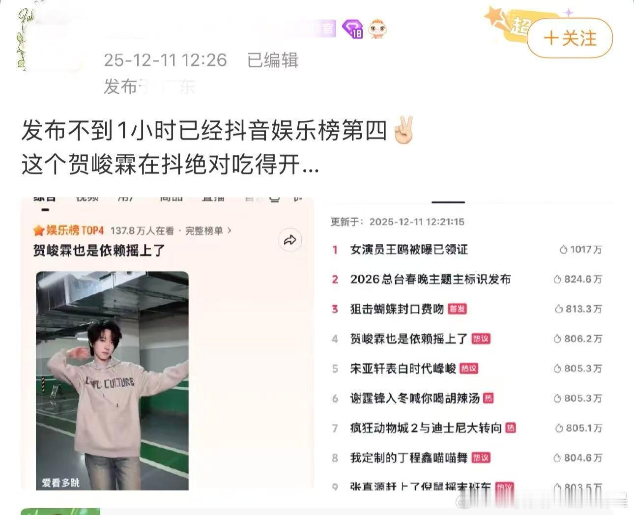 贺峻霖抖音娱乐榜第四 贺峻霖贺峻霖今天发布的视频已经登上抖音娱乐榜热搜第四名!不愧是18G网速冲浪达人,发出来的视频抖音的网友们都爱看~