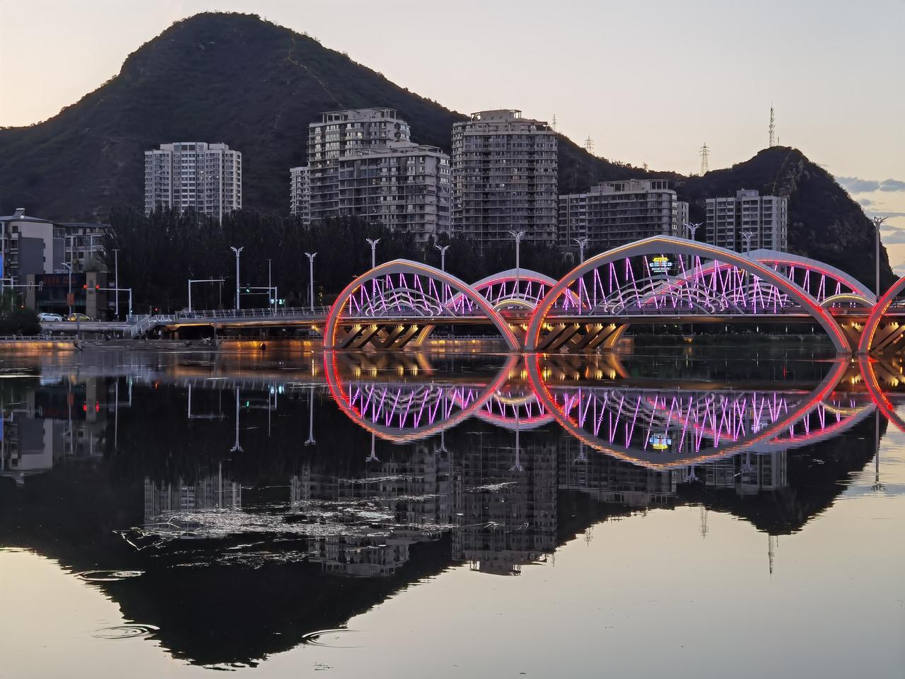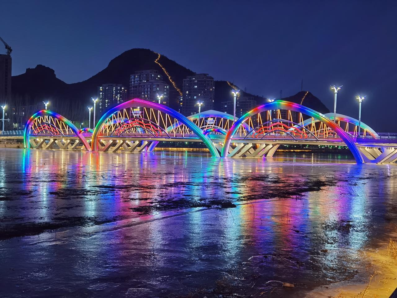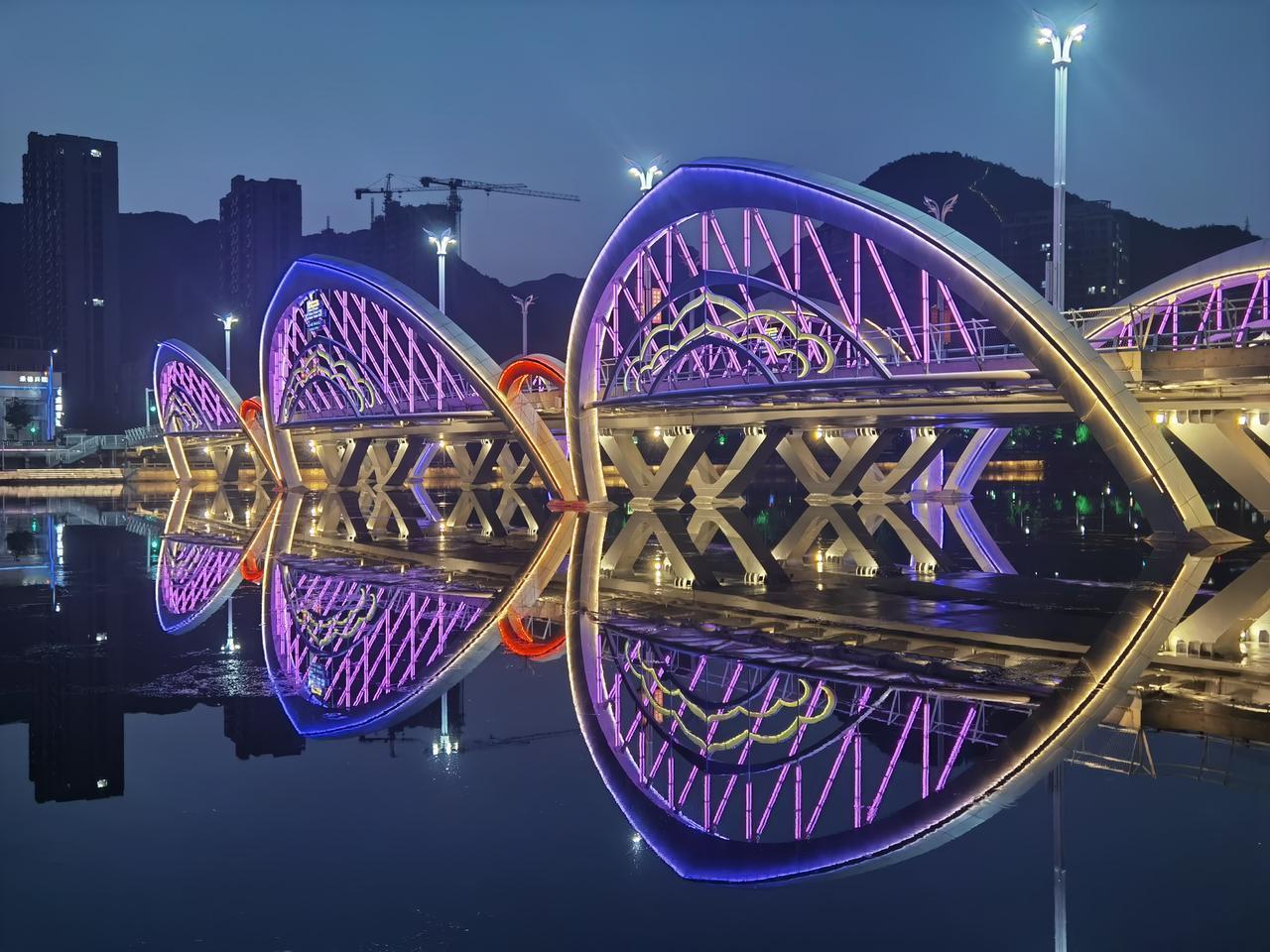 承德的夜,美丽而低调 ,璀璨而内敛。 承德不仅有避暑山庄和外八庙,还是一座山水园林城市。承德的夜,就在山水之间的四座桥。 第一座:乾阳步行桥,2011年11月9日竣工。连接山庄东路和普乐路,桥长151米,桥的形状以“卍”型展开,是一座廊桥。 第二座:铁路观光桥,建于1940年,最初为铁路运输桥,2007年7月铁路专线停止使用后改为为步行桥。其长度为301米,现仍保留未拆除的铁路轨道。 第三座:彩虹桥,2006年8月通车,桥长210米,全桥包括主桥、高架桥、引桥、地道桥,共计八座桥梁组成。因桥上配有灯光装饰,夜幕降临便会闪耀出七彩光辉。 第四座:莲花大桥(九华山大桥),2022年12月7日建成通车,桥梁全长218米,是座全钢箱梁结构桥梁。桥上三对莲花型桥拱晚上亮灯后,在武烈河上形成美丽的倒影。 四座桥梁自北向南分布在武烈河上,除第四座桥位置有些远,其他三座都在主城区,适合夜晚徒步欣赏夜景。