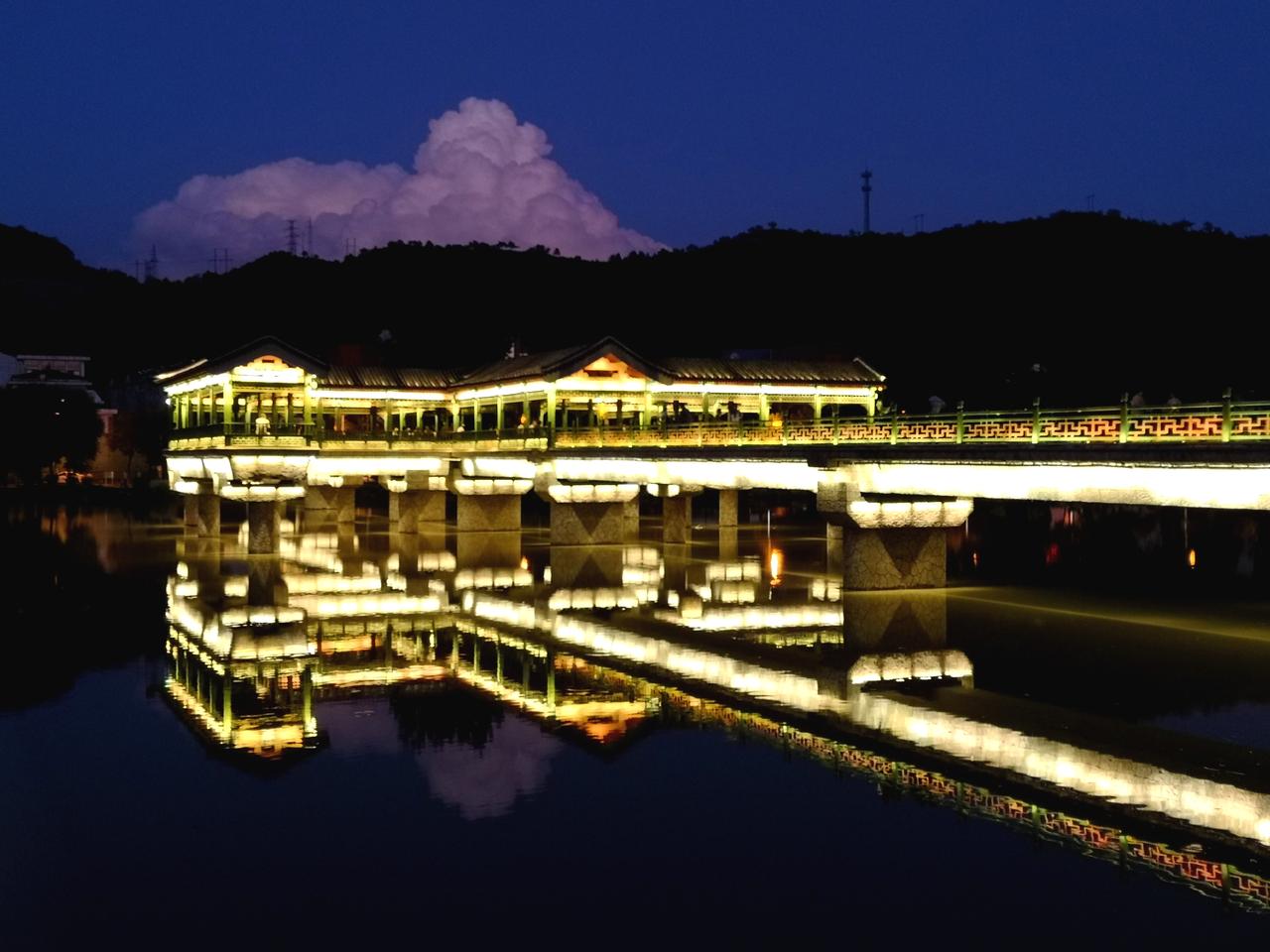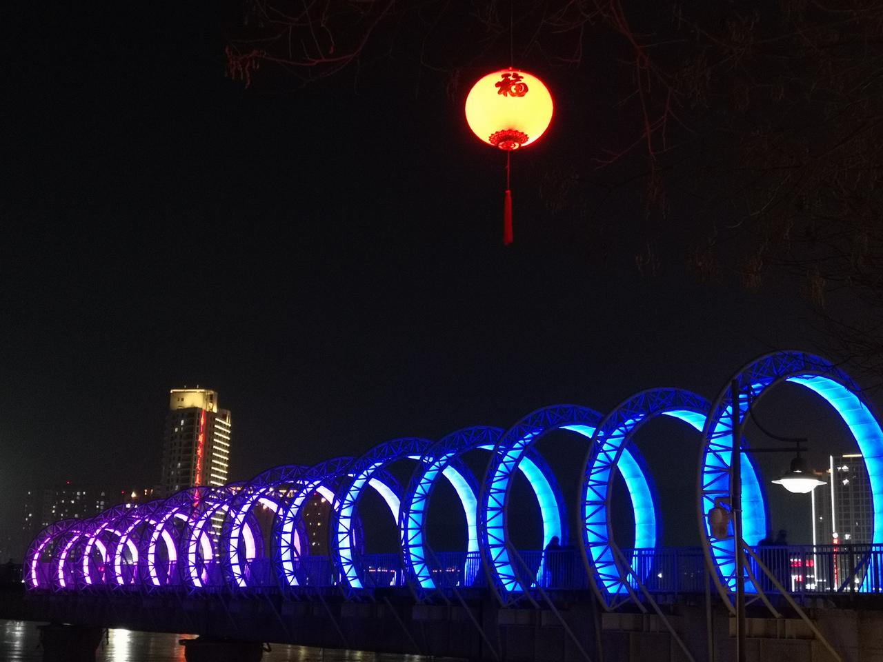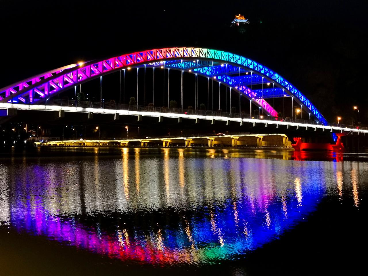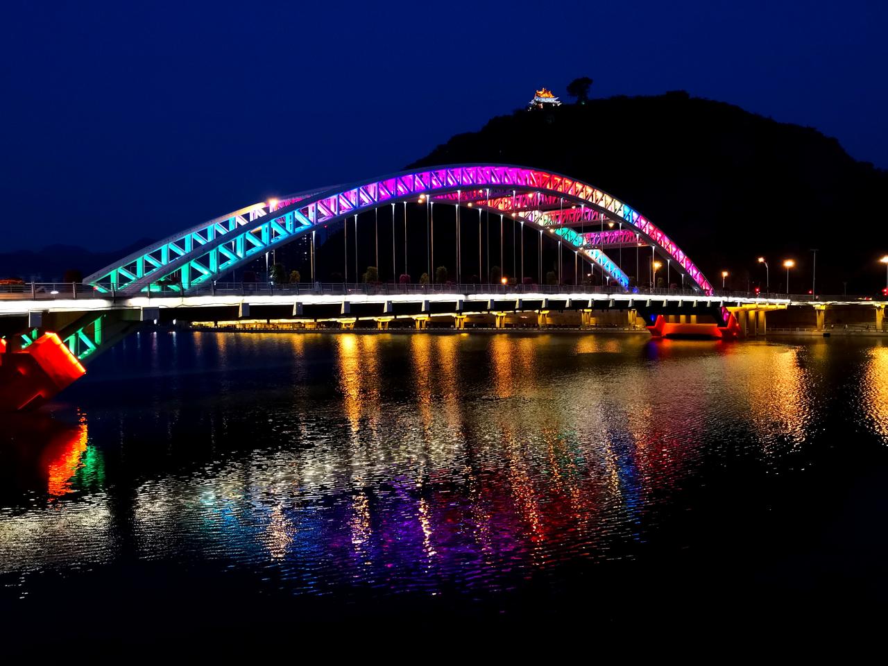 承德的夜,美丽而低调 ,璀璨而内敛。 承德不仅有避暑山庄和外八庙,还是一座山水园林城市。承德的夜,就在山水之间的四座桥。 第一座:乾阳步行桥,2011年11月9日竣工。连接山庄东路和普乐路,桥长151米,桥的形状以“卍”型展开,是一座廊桥。 第二座:铁路观光桥,建于1940年,最初为铁路运输桥,2007年7月铁路专线停止使用后改为为步行桥。其长度为301米,现仍保留未拆除的铁路轨道。 第三座:彩虹桥,2006年8月通车,桥长210米,全桥包括主桥、高架桥、引桥、地道桥,共计八座桥梁组成。因桥上配有灯光装饰,夜幕降临便会闪耀出七彩光辉。 第四座:莲花大桥(九华山大桥),2022年12月7日建成通车,桥梁全长218米,是座全钢箱梁结构桥梁。桥上三对莲花型桥拱晚上亮灯后,在武烈河上形成美丽的倒影。 四座桥梁自北向南分布在武烈河上,除第四座桥位置有些远,其他三座都在主城区,适合夜晚徒步欣赏夜景。