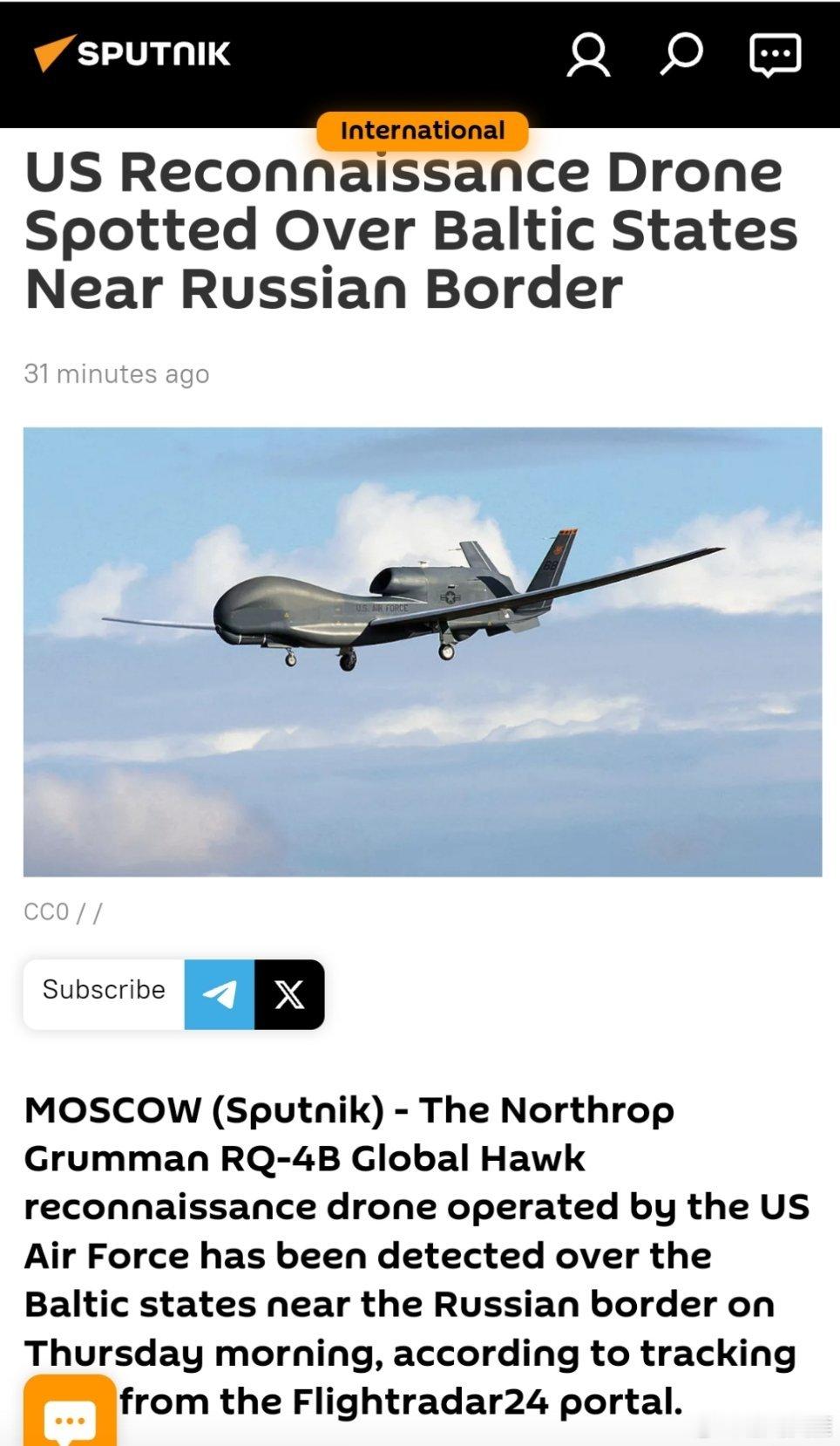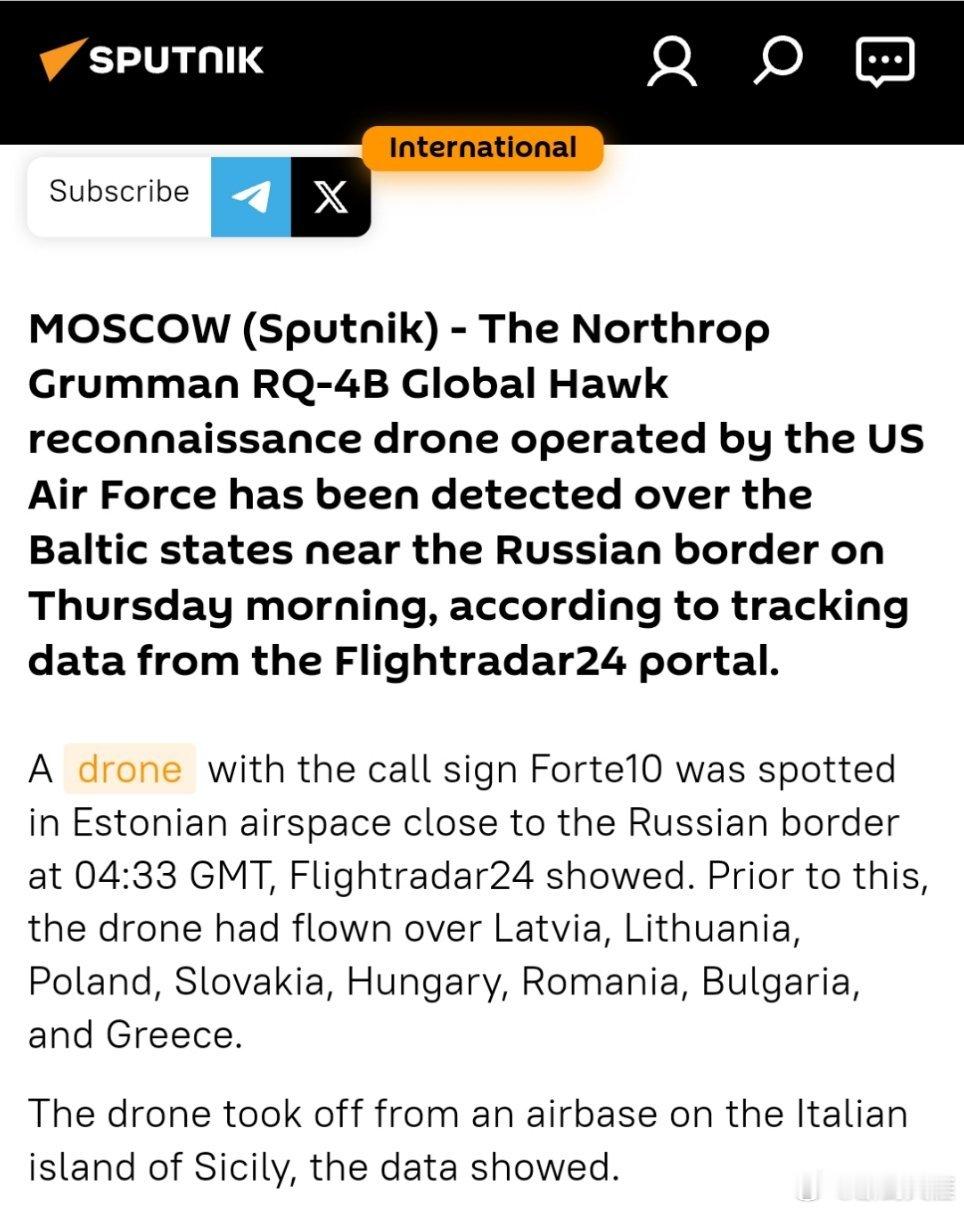 烽火问鼎计划国际军事武器装备 美国侦察无人机在靠近俄罗斯边境的波罗的海沿岸地区被发现。莫斯科(俄罗斯卫星通讯社)——据“飞行雷达 24”网站的追踪数据,美国空军所使用的诺斯罗普·格鲁曼公司研制的 RQ-4B“全球鹰”侦察无人机于周四上午在靠近俄罗斯边境的波罗的海沿岸地区被发现。“飞行雷达 24”网站显示,一架编号为“福尔特 10”的无人机于格林尼治标准时间 04:33 在靠近俄罗斯边境的爱沙尼亚领空被发现。在此之前,该无人机曾飞越拉脱维亚、立陶宛、波兰、斯洛伐克、匈牙利、罗马尼亚、保加利亚和希腊。数据显示,该无人机从意大利西西里岛的一个空军基地起飞。