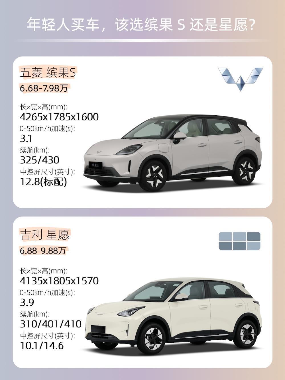 现在年轻人挑车也是想通了,不追求豪华、不要高性能,求的就是舒适实用、无焦虑。如果你要是这么想的,我觉得可以在吉利星愿与缤果S里挑一台,它们都是6万级起售,但却是什么都给到了。 要续航,星愿有三档可选,410km版本为7.68万元;而缤果S则有两挡可选,除了续航都要长一些,这430km版本为7.28万元、能省至少4000元,相对要更高效一些。 要性能,星愿以58kW入门,高配倒是有85kW,但除了价格高一些外,最大扭矩不过150N·m;而缤果S却是全系标配75kW电机,最大扭矩达180N·m,城里起步超车都更积极一些。 要智能,两车都是标配双屏,不过,星愿想要14.6英寸大屏+长续航至少得8.18万元,而缤果S却全系12.8英寸大屏并且融合了灵语AI+DeepSeek大模型,搭配扩展性更强的安卓车机,甭管交互还是娱乐其实都更突出。 说配置,两车都标配4气囊+倒车影像,星愿多了PM2.5过滤,但缤果S却是把定速巡航、50W无线充电、6扬声器,还有车外的LED大灯+感应雨刷全做为标配,真要在这俩里二选一,我觉得这入门当高配卖的缤果S确实更有诚意些。 更何况,缤果S还有巴斯夫8涂层车漆、有3D质感内饰等等,看上去也更动感且上档次些,确实也更适合年轻人的喜好。【来自懂车帝车友圈】