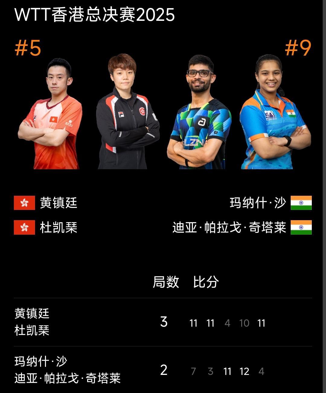 黄镇廷/杜凯琹取得小组首胜! WTT香港总决赛2025 混双小组赛,中国香港组合黄镇廷/杜凯琹以大比分3比2战胜印度组合沙阿/奇塔莱,取得小组赛首胜。 由于昨天比赛黄镇廷/杜凯琹不敌同组的林诗栋/蒯曼,两组合虽战绩都一胜一负,但黄镇廷/杜凯琹排在第三位,明天对阵孙颖莎/王楚钦! 期待!