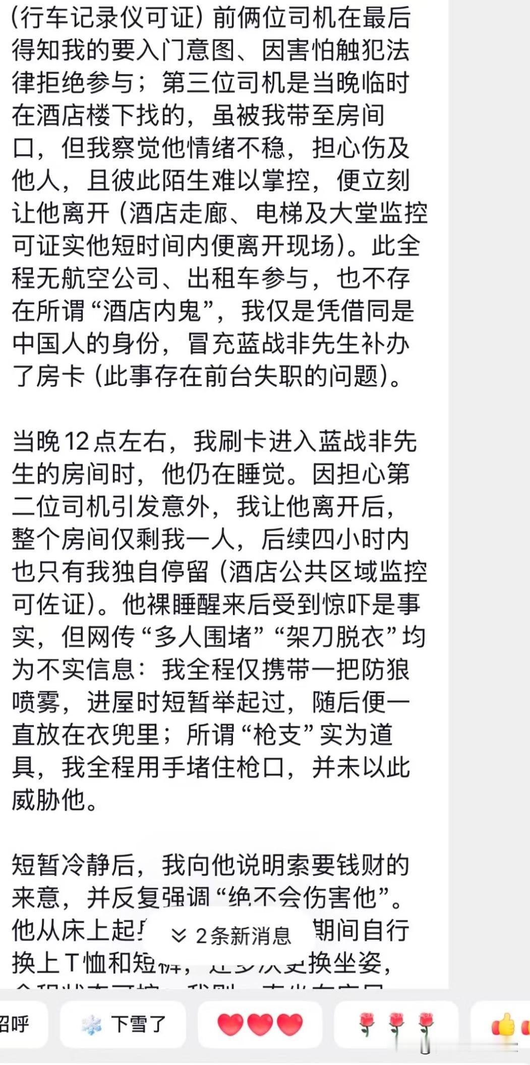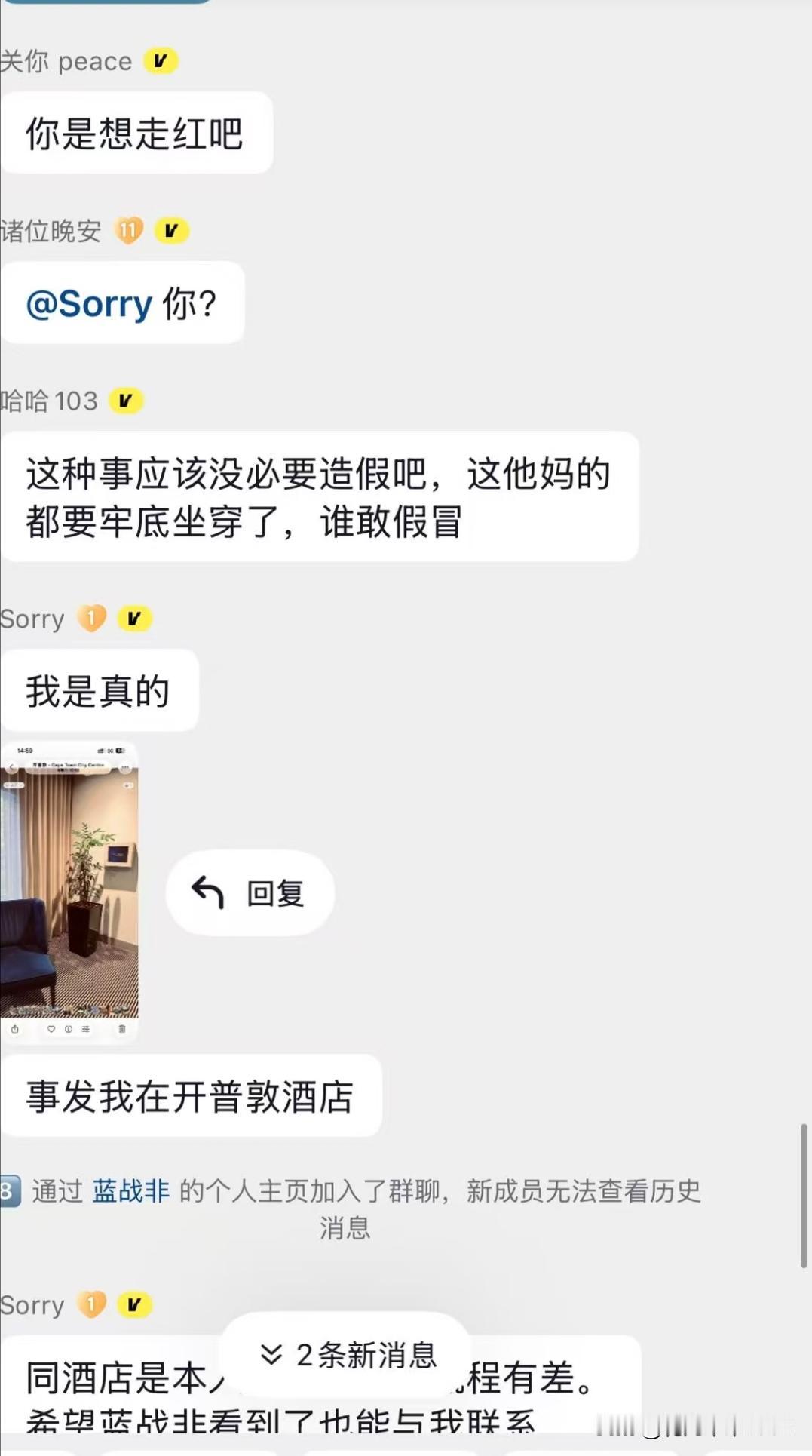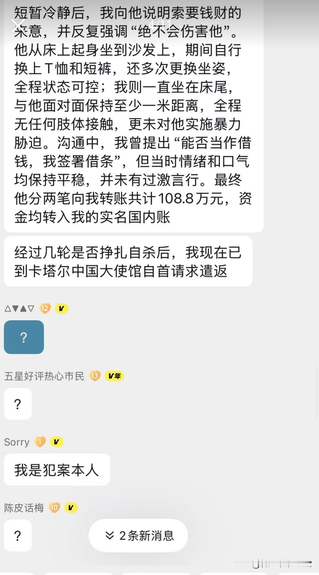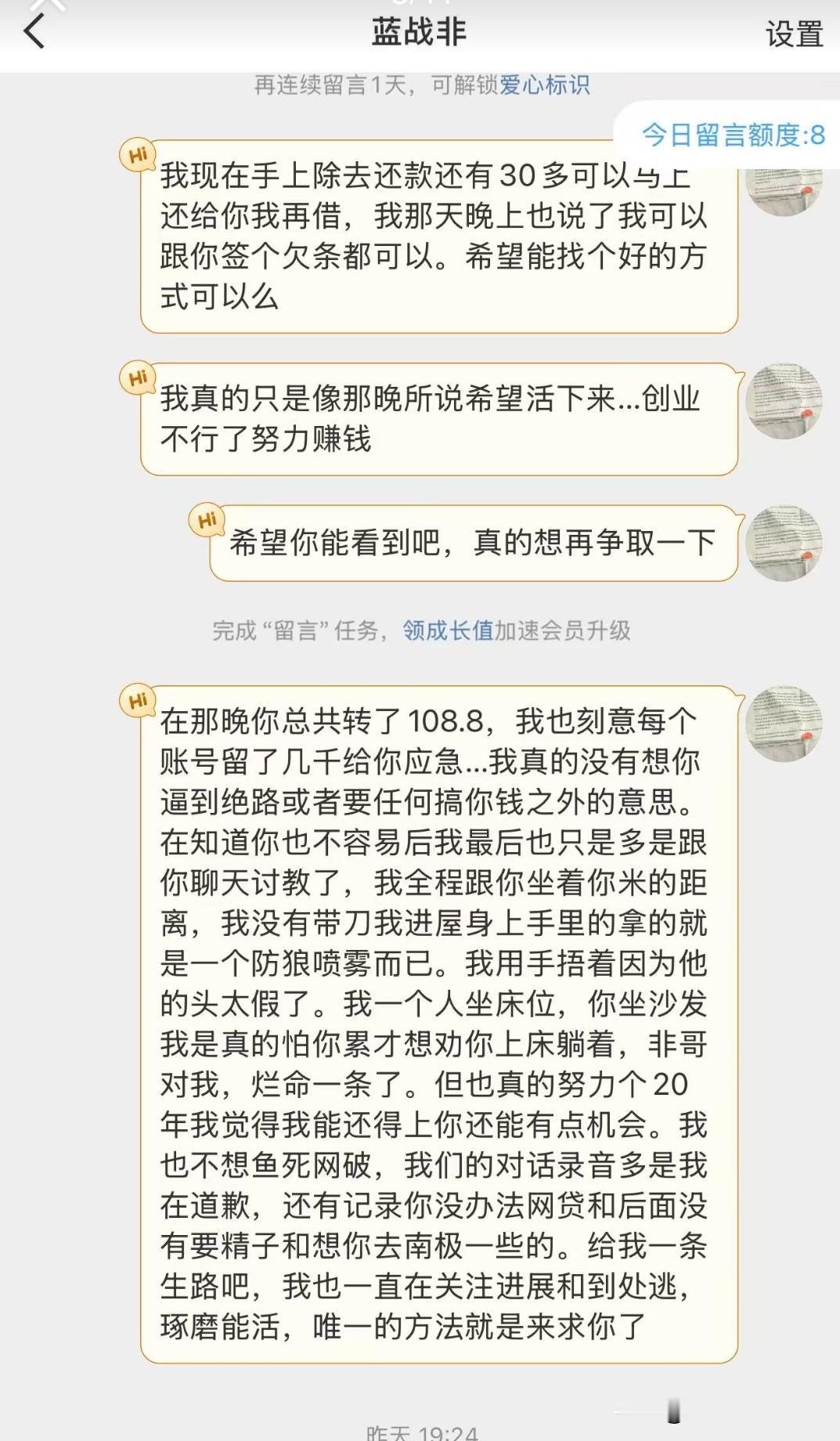 离谱!自称抢劫蓝战非的嫌犯居然主动现身。 刚刚有人在社群刷到了惊天大瓜,聊天记录显示,那个绑架抢劫了蓝战非的人主动在网上现身忏悔了。 他说自己是炒股和消费导致巨债缠身,然后得知蓝战非的行踪后,提前3天去往开普敦筹划。最后是他一个人冒充蓝战非去前台补办了房卡。 根据他的说法,他没有持刀威胁蓝战非,只拿了一个防狼喷雾,全程没有肢体接触。最后拿到钱是两笔,加起来正好是108.8万, 事发后他给蓝战非私信希望私了,愿意退钱,没有得到蓝战非的回应后,目前已打算向卡塔尔中国大使馆自首了。