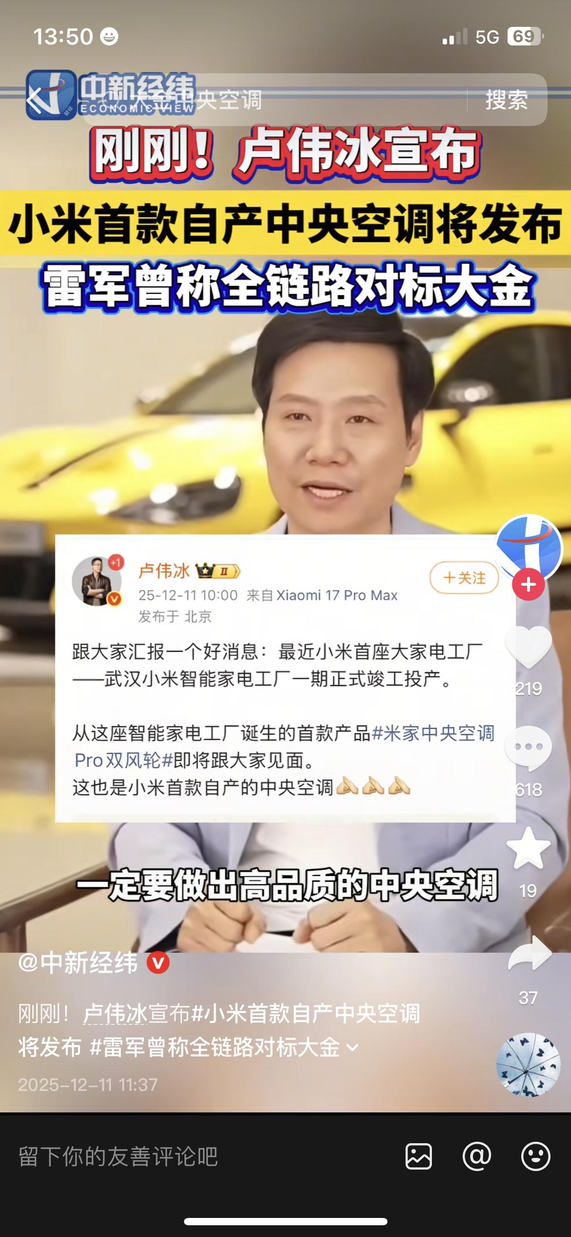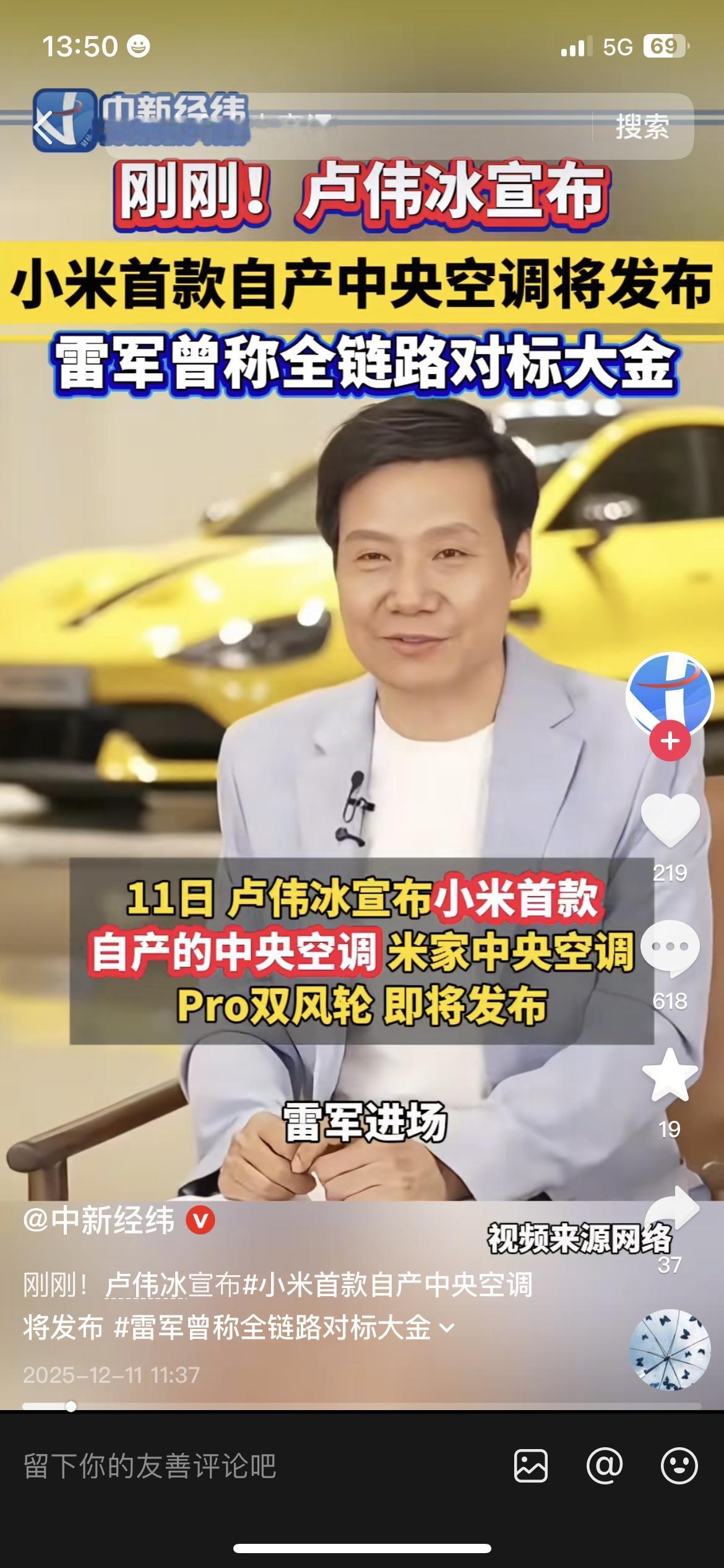 赶紧看!小米要出自产中央空调了,雷军对标大金 家里要装中央空调的别错过! 12月11日卢伟冰官宣,小米首款自产中央空调要发布了, 武汉智能家电工厂也正式投产,雷军还说全链路对标大金。 咱普通人选中央空调,又多了个新选择, 你会考虑小米的中央空调吗?评论区说说看法。小米格力空调