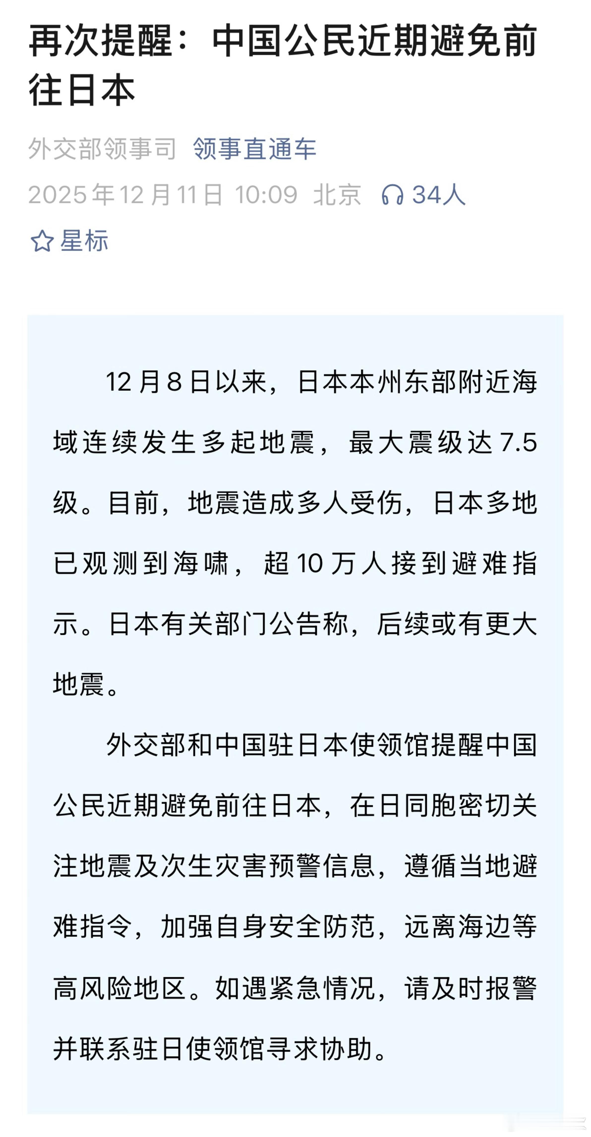 紧急提醒国家真的是苦口婆心,讲的话大家一定要听进去。今天(11日),外交部紧急提醒:中国公民近期避免前往日本。这个提醒,针对的是12月8日以来,日本本州东部附近海域连续发生多起地震,最大震级达7.5级。目前,地震造成多人受伤,日本多地已观测到海啸,超10万人接到避难指示。日本有关部门公告称,后续或有更大地震。外交部和中国驻日本使领馆提醒,中国公民近期避免前往日本,在日同胞密切关注地震及次生灾害预警信息,遵循当地避难指令,加强自身安全防范,远离海边等高风险地区。如遇紧急情况,请及时报警并联系驻日使领馆寻求协助。与此同时,今天中国驻日本大使馆也提醒在日中国公民,积极下载“中国领事”APP或通过“中国领事”微信小程序参与登记。登记了,就能够进一步帮助在日中国公民更好获得领事保护与服务。特别再提醒一句,“海外公民登记”不会要求提供银行账户等个人信息,更不会要求转账汇款,请提高安全防范意识。再次提醒中国公民近期避免前往日本中国领事晏秋秋