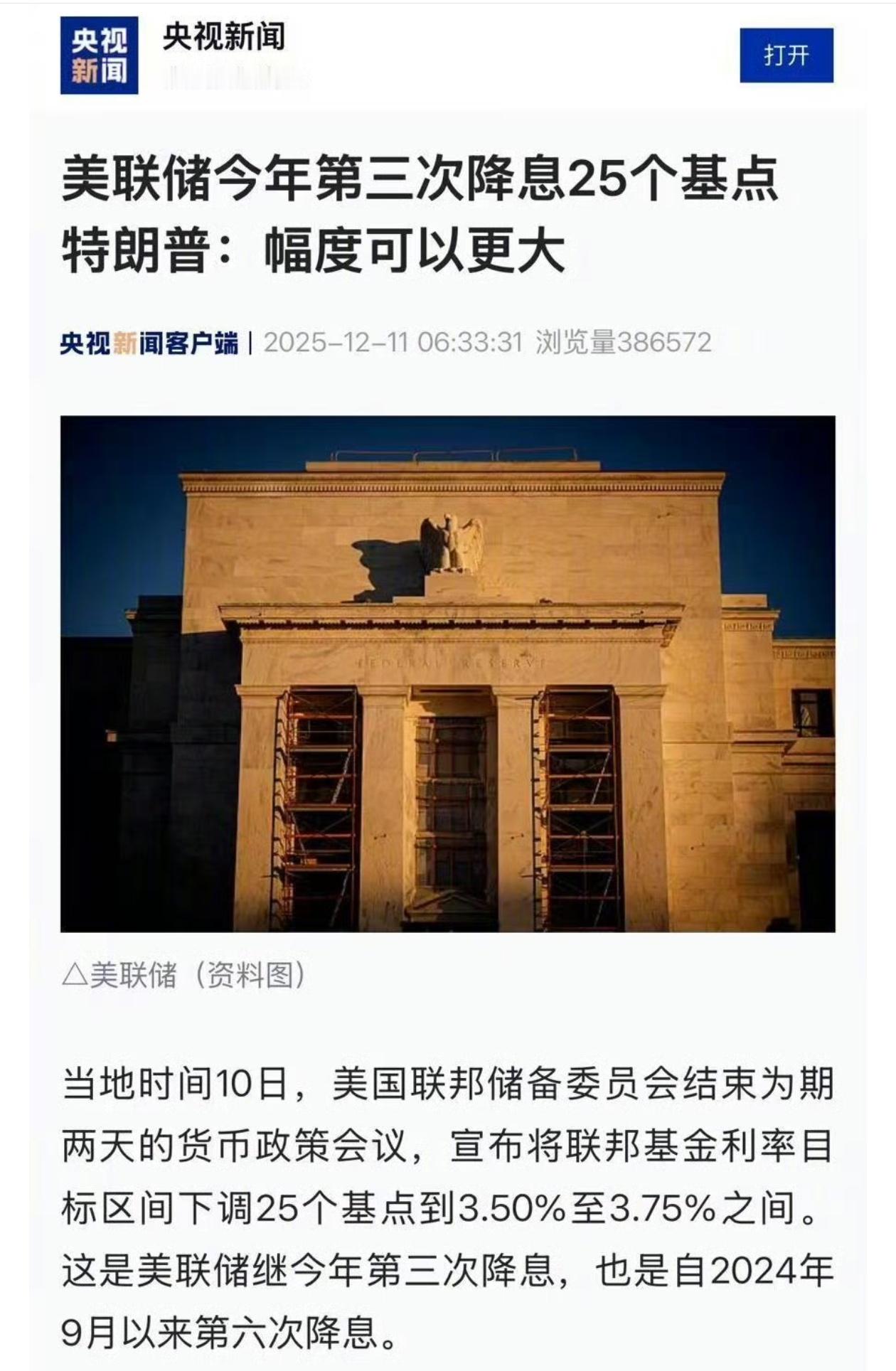 美联储宣布降息25个基点 之前相关机构就说美联储九成几率会降息,降息终于如期而至。美国联邦储备委员会宣布将联邦基金利率目标区间下调25个基点到3.50%至3.75%之间。这是美联储继今年第三次降息,也是自2024年9月以来第六次降息。鲍威尔指出,美国关税政策导致通胀过高。特朗普则表示降息幅度太小,本可以更大。