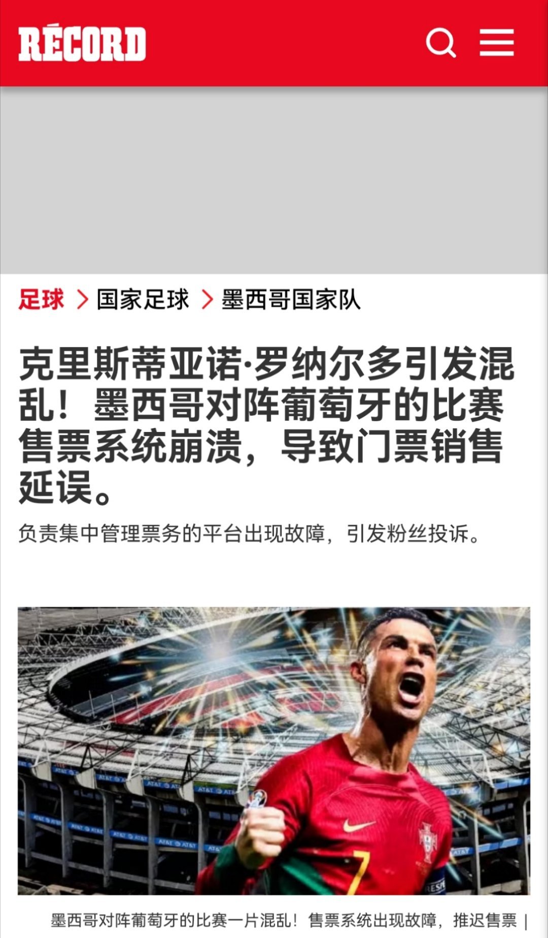 C罗 据墨媒每日记录报超高人气引发混乱!墨西哥对阵葡萄牙的比赛售票系统崩溃,导致门票销售延误。负责集中管理票务的平台出现故障,引发粉丝投诉。为了出售这些门票,巴诺特体育场选择使用与Ticketmaster 不同的票务公司:Fanki,这是一个哥伦比亚平台,负责墨西哥和葡萄牙比赛门票的销售。然而,由于用户购票需求量巨大,该平台出现了一些问题。在社交媒体上,用户纷纷抱怨该服务,因为网站和应用程序多次崩溃。门票销售甚至不得不推迟;原定于墨西哥中部时间上午9:00开始,但推迟到上午9:30。然而,一些用户仍然无法访问网站购买门票。C罗贴地斩破门利雅得胜利4比2阿布扎比统一