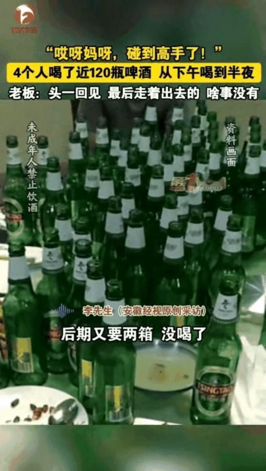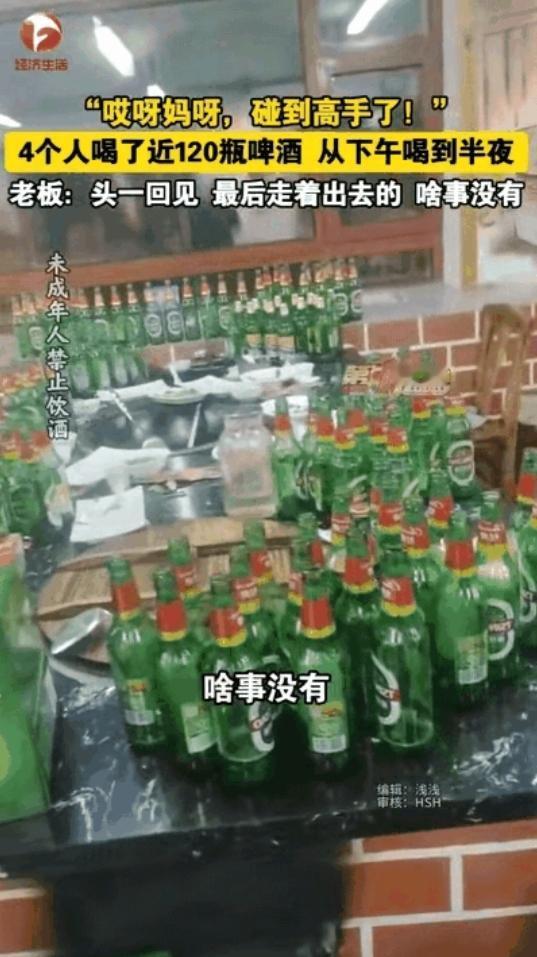 彻底解释不清了! 吉林,四个人吃饭,点了一桌子菜,从下午5点多吃到半夜12点,吃完,前脚刚走,服务员进来一看都惊呆了,4个人喝了近120瓶啤酒!最关键的是他们走的时候也不晃悠,啥事没有。老板直呼“哎呀妈呀,碰到高手了!” 有网友评论: 现在的啤酒路饮料差不多,八九十年代的啤酒特别是八十年代的,那才是真正的啤酒。 这是怎么喝下去的平均每人30瓶,太吓人了真是酒囊饭袋,怎么装进肚子里的! 这是500毫升的吧,当年去学车,过科目三后一起庆祝一下,我去,四个人喝了四箱大连大棒,我只喝了六瓶,其它三个人分了,那时都是一箱24瓶600ml的,我那次成了真正的棒槌[笑哭] 现在的啤酒没多少酒劲。年轻人当喝水一样,前此天去河北有一五十多的人,喝了一瓶老白干50多度的,又喝了两瓶啤酒,饭也不吃就走了,说是去干活去,投资百万养鸡的。这点酒对人家一点不影响干活![呲牙] 对此,大家怎么看呢?