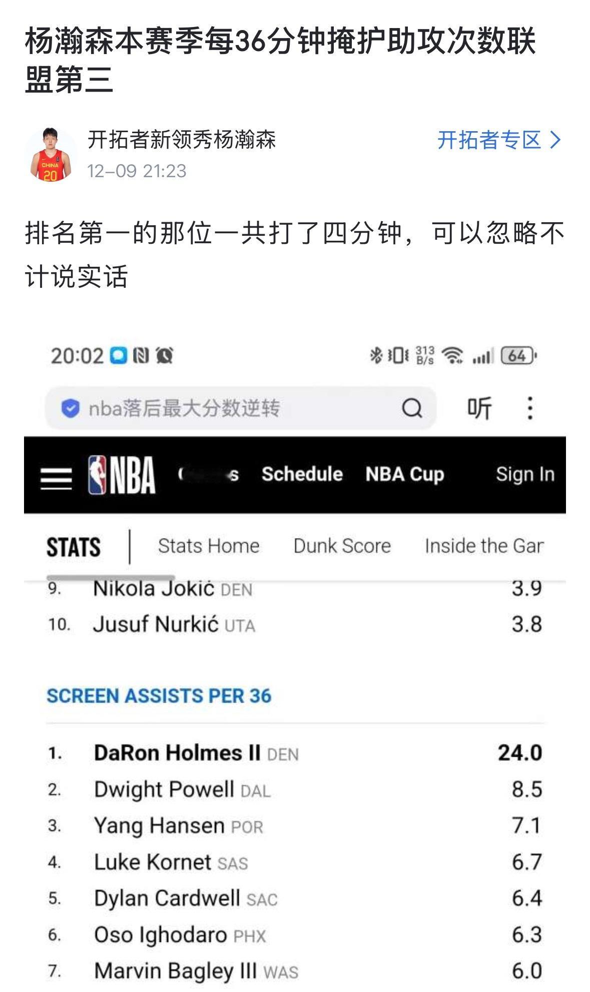 杨瀚森本赛季每36分钟掩护助攻次数联盟第三