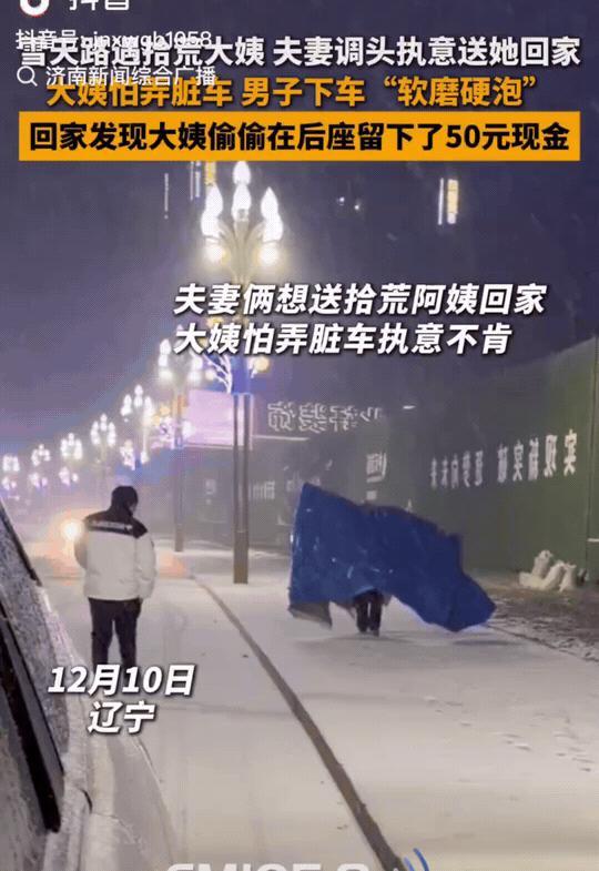 泪目!辽宁抚顺,大雪纷飞的夜晚,刘女士夫妻俩送一位捡废品的大姨回家。没想到,大姨竟然这样做:偷偷地在后座留下50元钱。 刘女士的老公接她下班,路上看到一位大姨拿着废品,披着防雨布在大雪中走着。本来车都开过去了,刘女士的老公又掉头回来了。他担心大姨走许久才能到家,就想着送大姨一程。 刘女士老公下车去找大姨,没想到大姨怕东西多,弄脏他们的车,一直拒绝。最后,劝了半天,大姨才上车。 由于大姨的东西多,后备箱放不下,就把后座放倒了。大姨下车后,就是偷偷的把钱放到了后座上。刘女士他们回去整理车的时候才发现。 其实,在路上大姨一直说要给钱,他们说不要钱。没想到大姨竟然偷偷的留下了50元。这50元钱,她得捡多少天废品才能挣到啊?刘女士想着能不能再遇到大姨,把钱还给她。 都是善良的人!刘女士夫妇体会大姨大雪天回家不方便,就愿意送她一趟。大姨怕给别人添麻烦,就偷偷地放下了对她来说,需要好几天才能挣到的50元钱。双向奔赴的善意,真的很让人感动。 正是有了这些善良的人,发生了许多温暖的故事。即使外面大雪纷飞,但是人们的心里异常的温暖和火热。 网友说: “我们东北人骨子里的善良,年轻人做出了尊老的品德,大姨做出了长辈的善良感性,愿我们黑吉辽,愿我们的大美东北越来越好,加油我东北的兄弟姐妹!” 虽然大东北天气寒冷,但是东北人的热情豪爽感染着全国各地的人们。