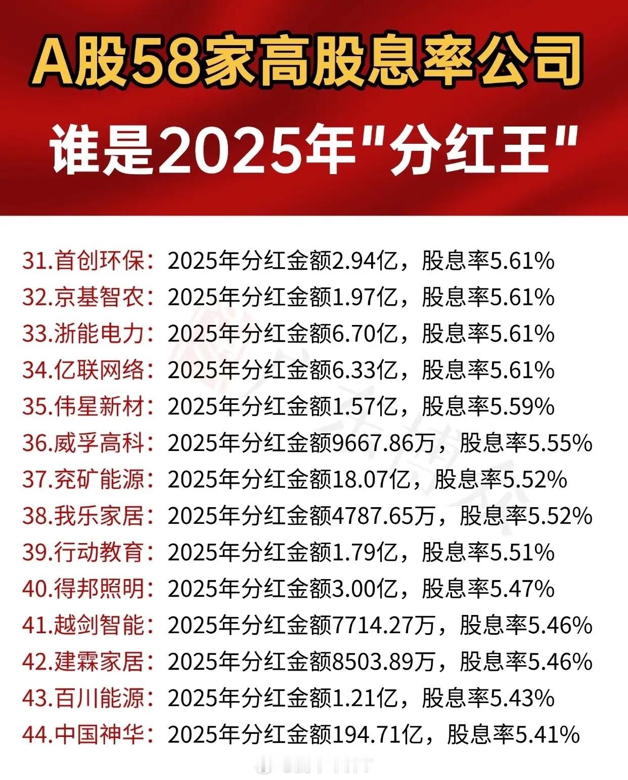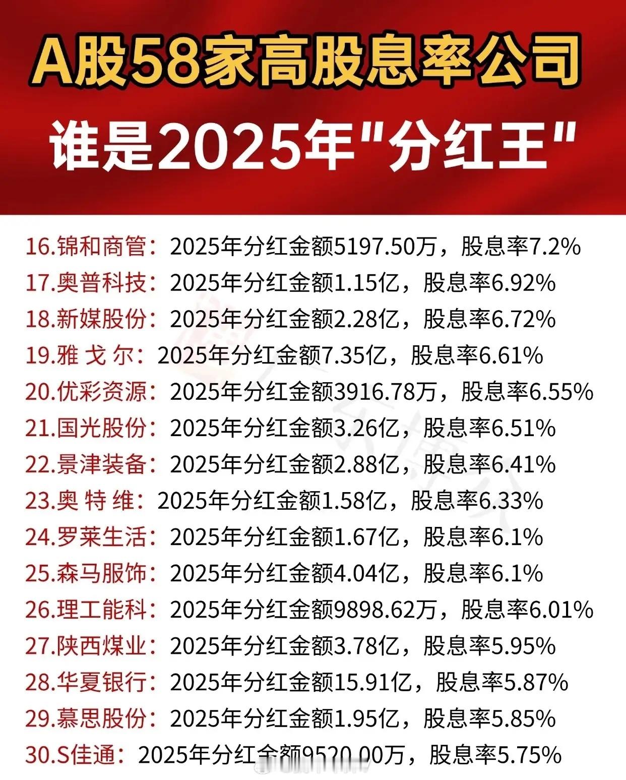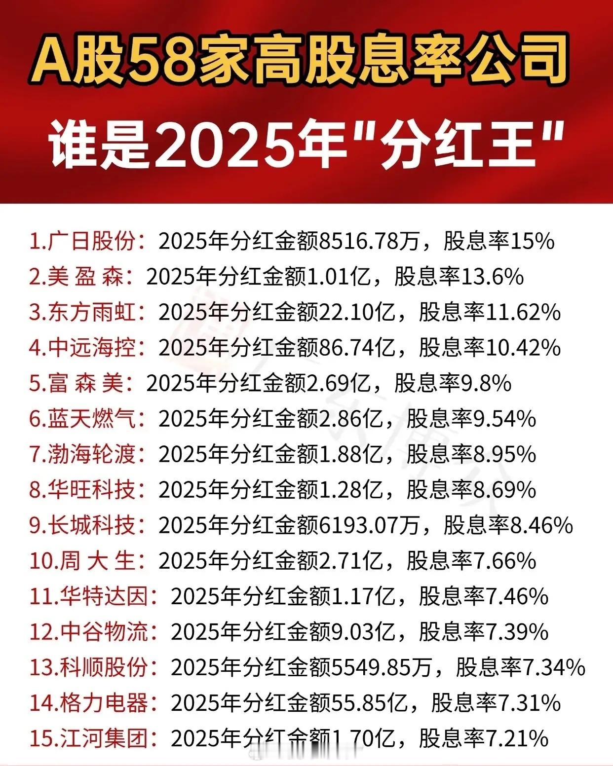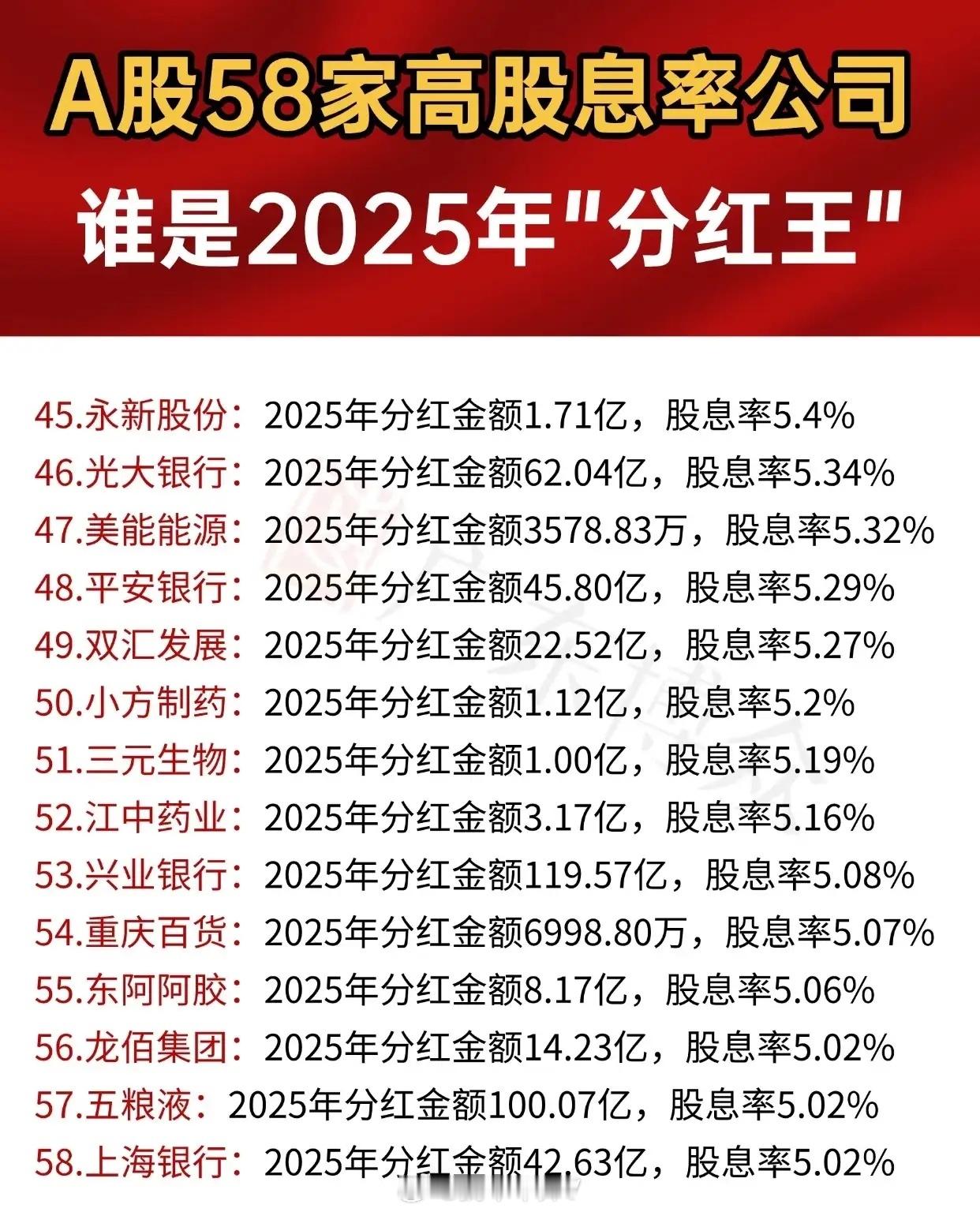 “A股58家高股息率公司 谁是2025年‘分红王’”,呈现58家公司2025年分红信息(含公司名、分红金额及股息率),并按股息率从高到低排序。前15家公司中,广日股份以15%的股息率居首,分红8516.78万;美盈森股息率13.6%、分红1.01亿紧随其后;东方雨虹分红22.10亿、股息率11.62%;中远海控分红86.74亿、股息率10.42%;富森美、蓝天燃气等依次排列,第15名江河集团股息率7.21%、分红1.70亿。16-30名里,锦和商管股息率7.2%、分红5197.50万排第16;奥普科技、新媒股份、雅戈尔等依次上榜,第30名S佳通股息率5.75%、分红9520.00万。31-44名涵盖首创环保(分红2.94亿、股息率5.61%)、京基智农等多家股息率5.61%的公司,还有浙能电力、亿联网络等;第44名中国神华分红金额突出,达194.71亿,股息率5.41%。45-58名中,永新股份股息率5.4%、分红1.71亿排第45;光大银行分红62.04亿、股息率5.34%;后续有平安银行、双汇发展等,第57名五粮液分红100.07亿,第58名上海银行分红42.63亿,两者股息率均为5.02%。整体通过分批次列表,直观展示了58家高股息率公司的2025年分红情况,方便对比各公司分红规模与股息率水平。