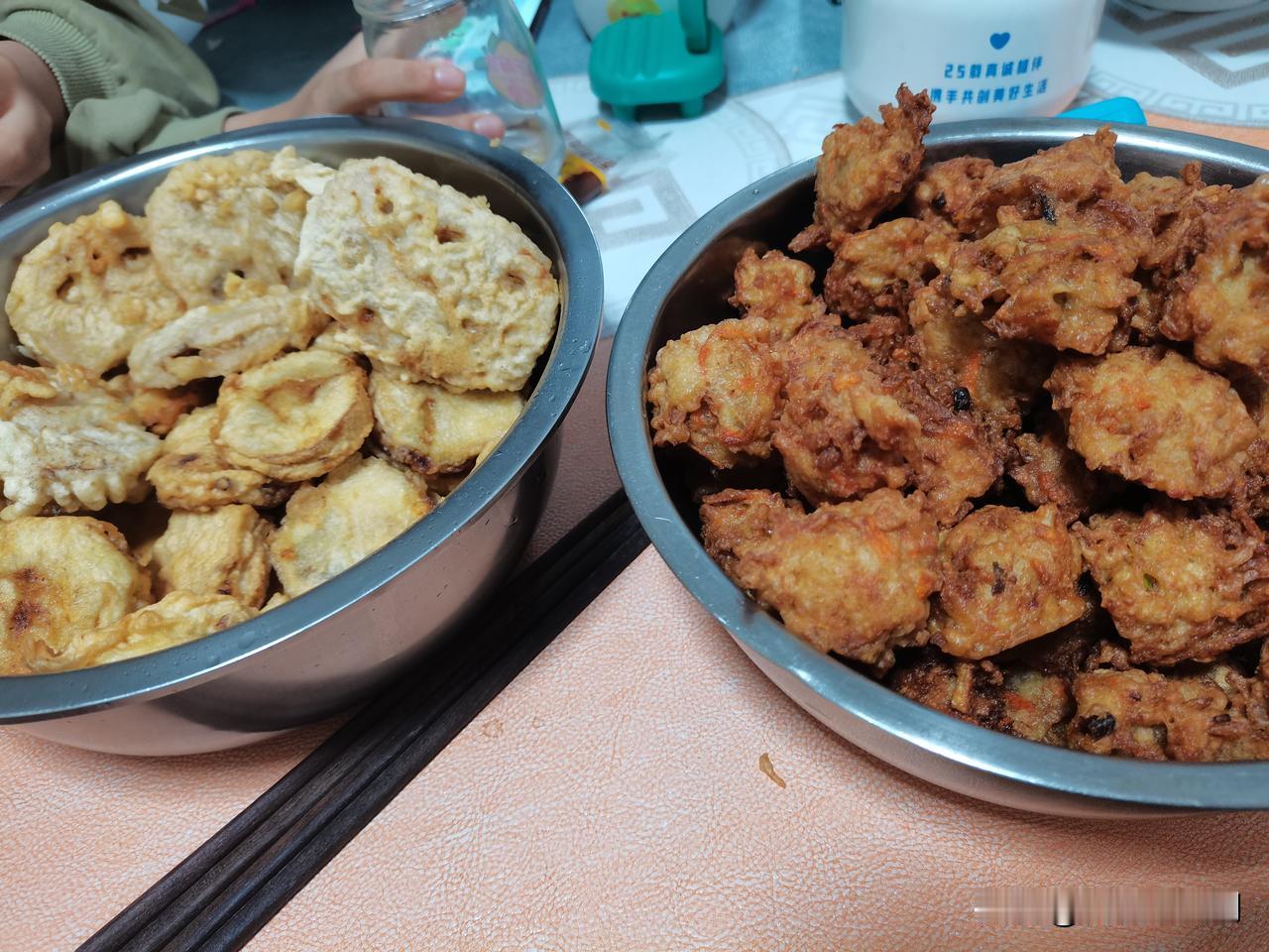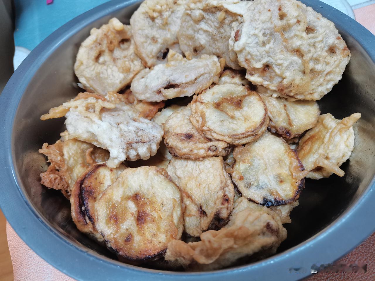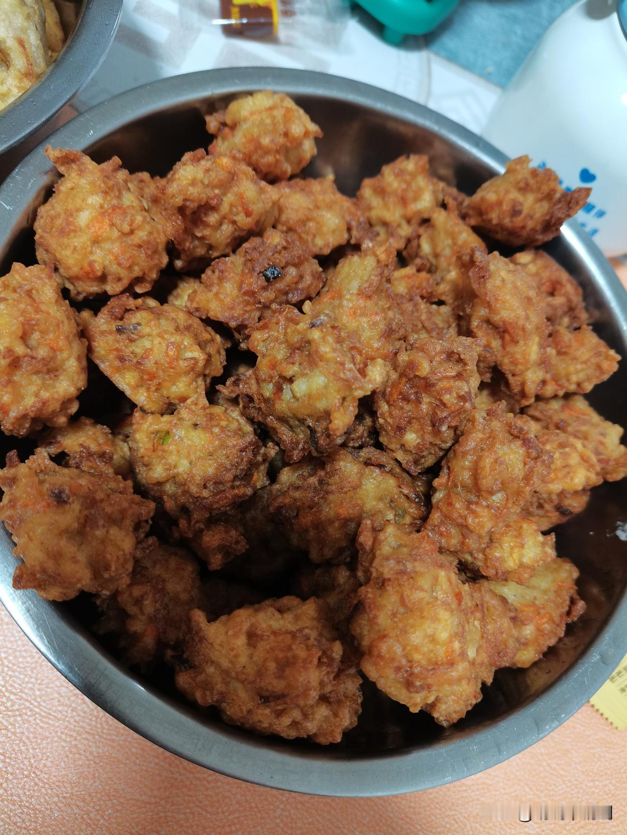 冬天正是吃萝卜的季节,有句养生谚语说的好“冬吃萝卜夏吃姜,不劳医生开药方。”晚上回来给孩子们炸了点青萝卜丸子,顺便还炸了点儿茄盒和藕盒。 炸茄盒和藕盒时油温有点低了,好像没炸上色,不过味道还行,毕竟里面都夹了肉馅了,不好看的品相用肉馅的美味给弥补了,孩子们吃的挺开心。 今天的晚饭有点简单,不过是真的费时费力,从进门就开始忙活,拌肉馅,擦萝卜,焯水,调面糊,到炸出来,差不多忙活了一个来小时,孩子们等的都饿了。 油炸食物虽好吃,但不够健康,偶尔吃一顿还行,不建议经常吃。
