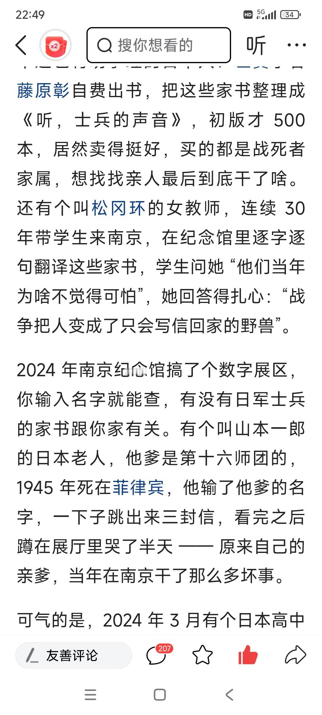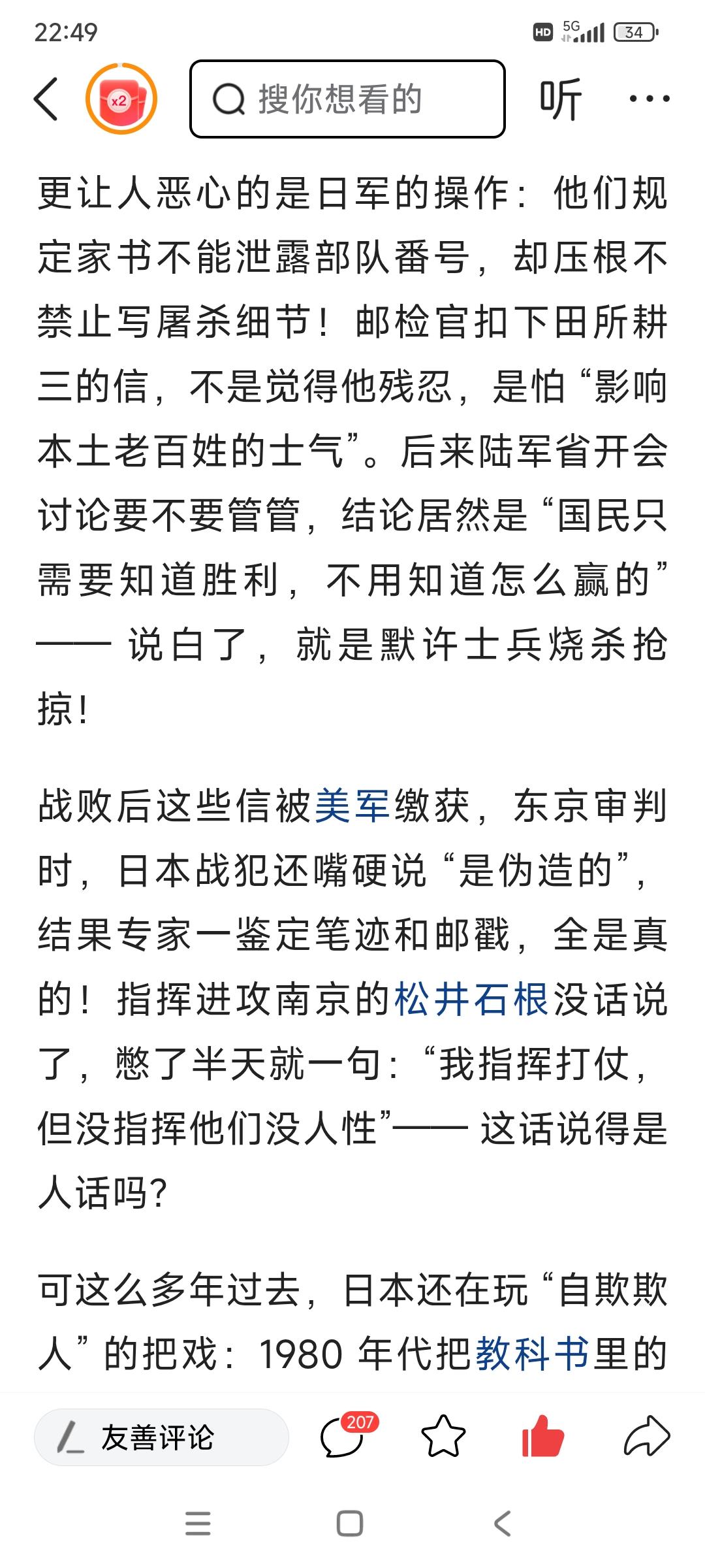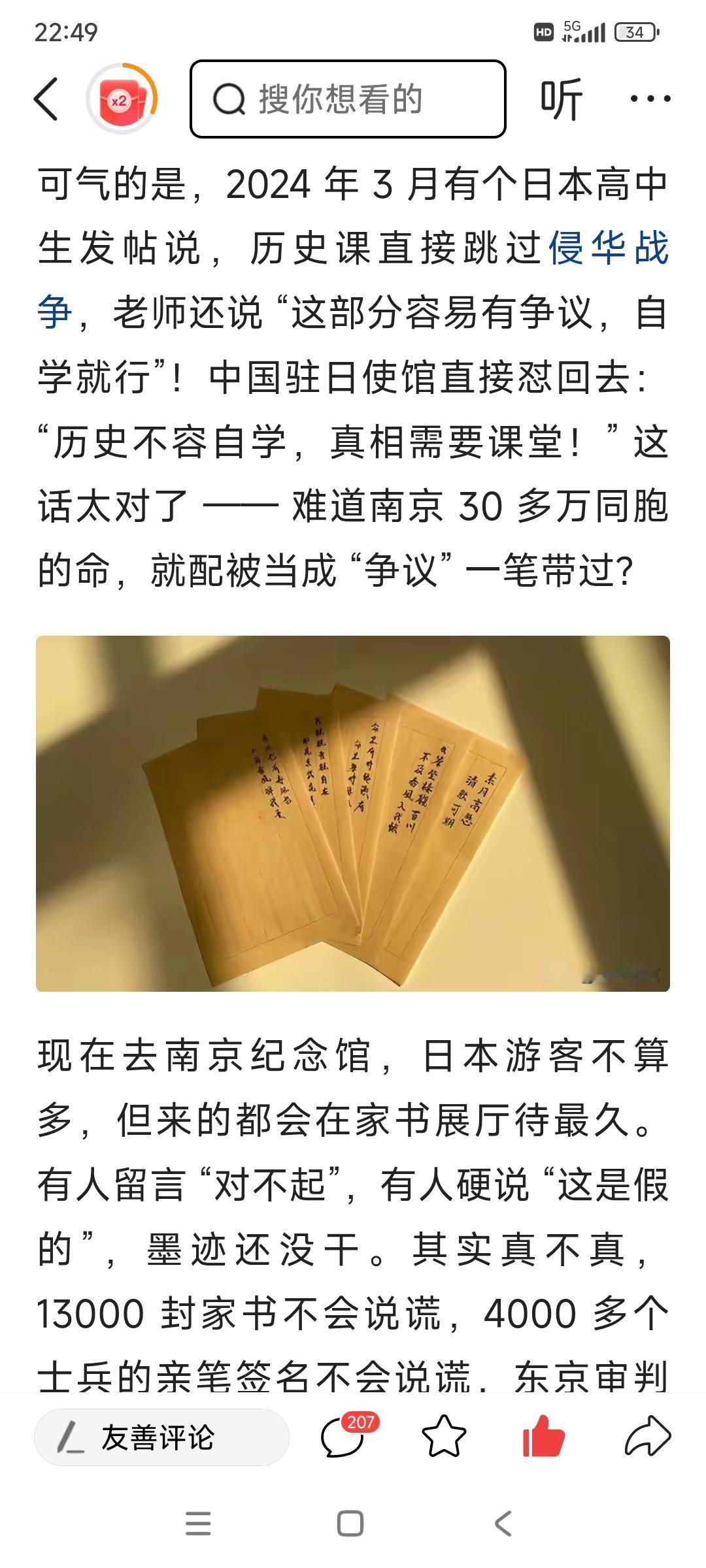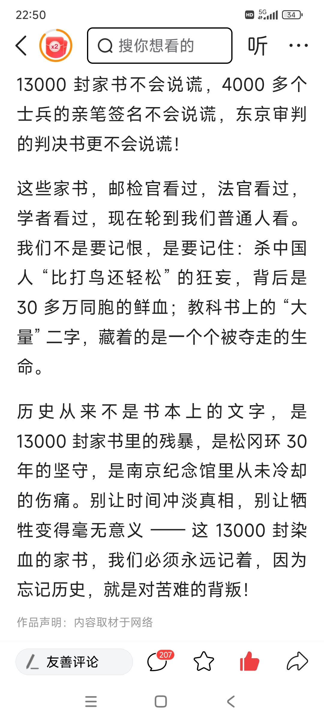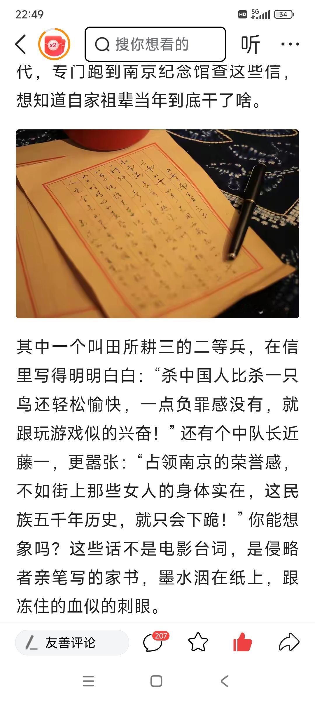 日本侵华,罪大恶极,铁证如山,不容狡辩! 没有这13000封日军家书,日军在中国犯下的滔天罪行依然是铁证如山,将被永远钉在耻辱柱上!这些日军家书只是佐证或补充材料,从另一个侧面印证了当年日军的冷血与残暴! 一个名叫田所耕三的士兵告诉家人:“杀中国人比杀一只鸟还轻松愉快,一点负罪感没有,就跟玩游戏似的兴奋!” 一个叫近藤一的日军中队长公然宣称:“占领南京的荣誉感,不如街上那些女人的身体实在!” 可以推想,日军士兵不可能把他们犯过的所有罪恶都告诉家里人,尤其是那些过于残忍、血腥变态的罪行。也就是说,家书中所展现的恶行只是部分而非全部,而且很可能是避重就轻的! 日军也对这些士兵的书信进行检查,但这些书信得以放行,显然是日军管理层并不认为有什么不妥,说明他们对日军的残暴行为是默许甚至纵容的! 对此,日本人有的认罪忏悔,有的质疑家书造假,可东京审判的判决书早已认定为真迹,真相不会被掩盖! 我们唯一能做的就是,牢记历史,勿忘国耻,奋发图强,振兴中华,绝不让历史悲剧重演!