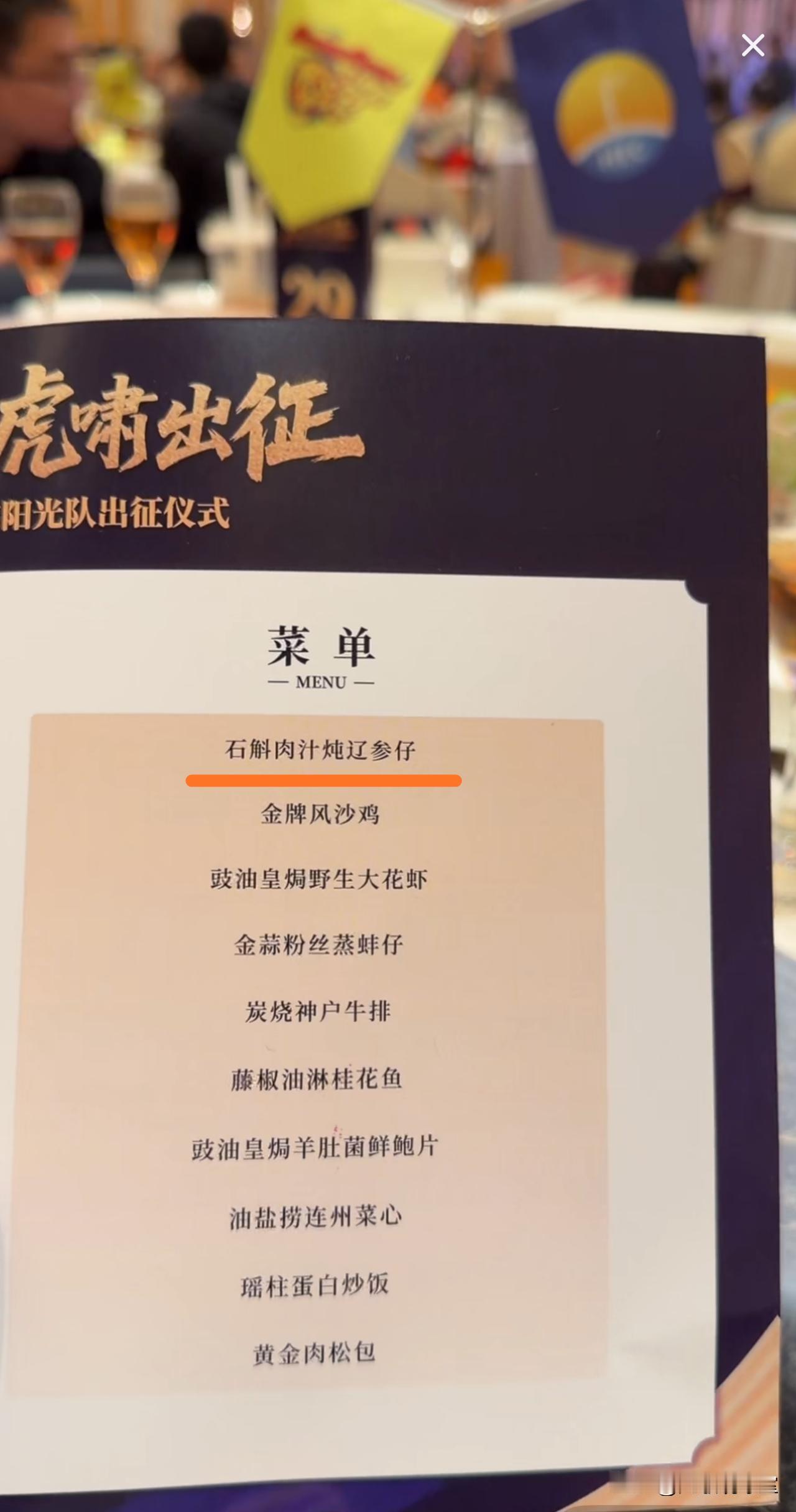不知道广东球迷有没有观看广东队出征仪式直播?发现广东宏远俱乐部安排的晚宴上有十道菜,其中菜单上的第一道菜就是“石斛肉汁炖辽参仔”,这也太有意思了,我知道广东有例汤叫石斛煲老鸭汤,没想到还有石斛肉汁炖辽参仔,球队给球员安排的第一道菜就是炖辽参仔,这是不是有什么说法嘛?