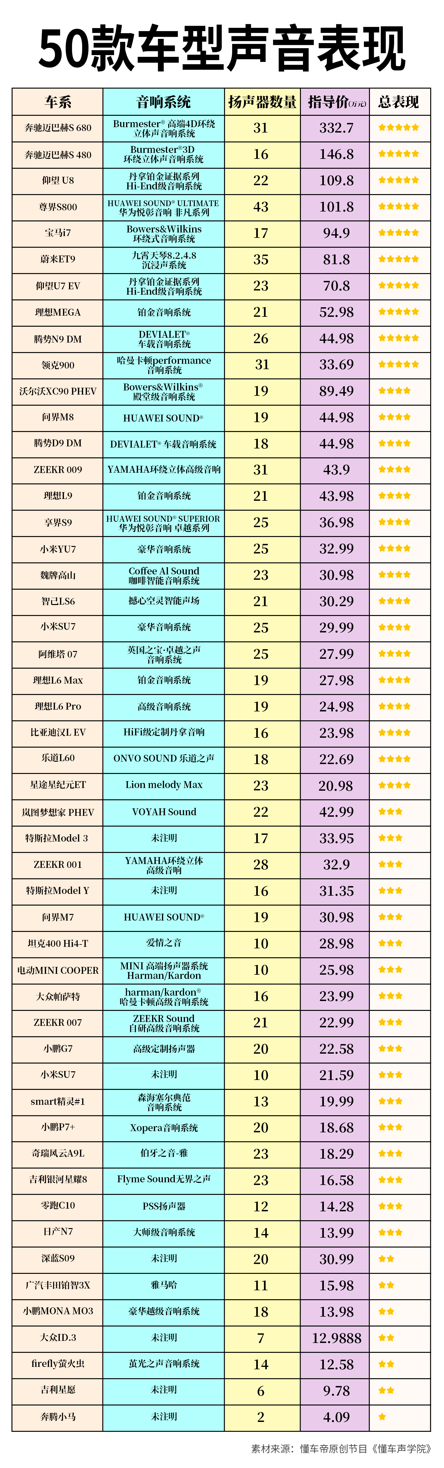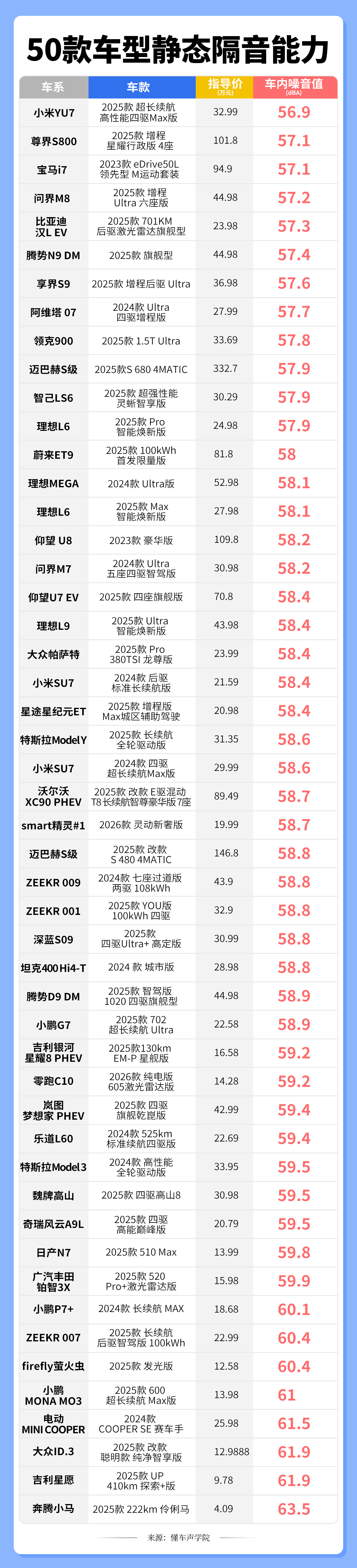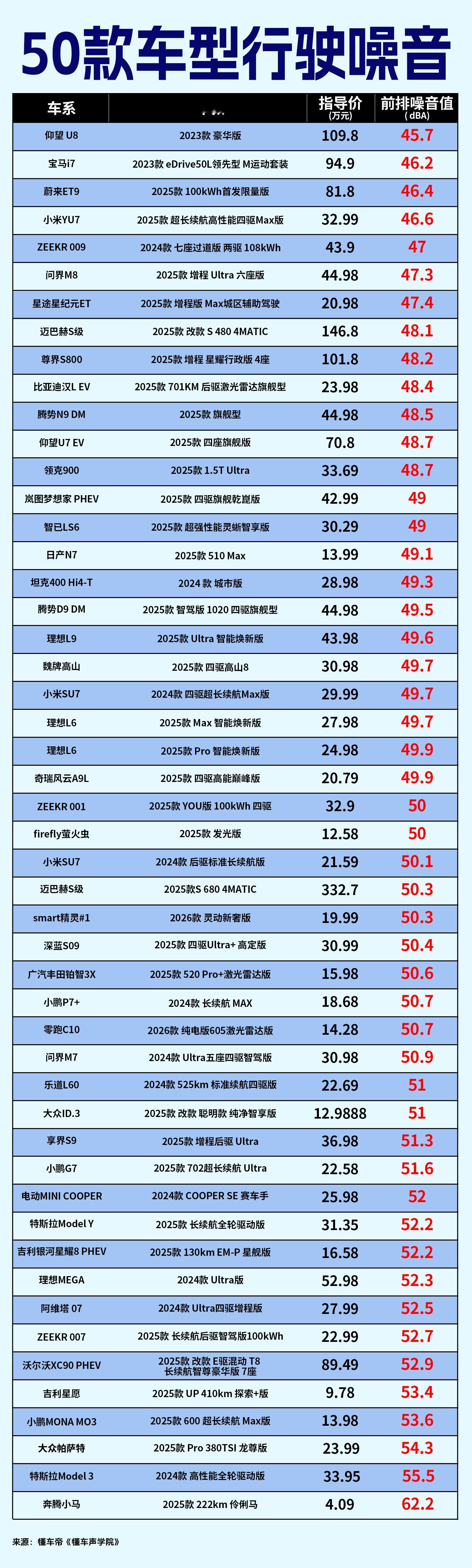 听声音就能判断一辆车值不值 这次懂车声学院50款车型的具体声音表现,包括综合表现、行驶噪音前排噪音值、静态隔音项目里的车内噪音值。想要的建议收藏、下载、打印。当然,数据是数据,音响根据个人喜好,去实际体验也是需要的。 汽车音响音质好坏怎么看