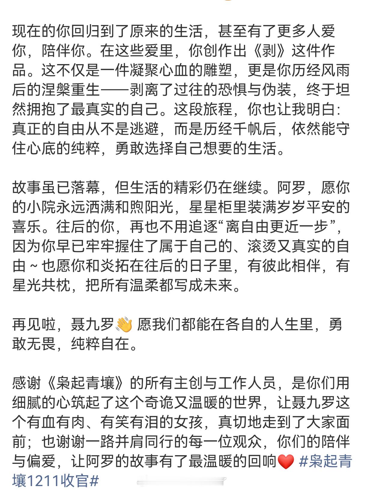 迪丽热巴《枭起青壤》收官发文,看得我好感动啊 一路看过来热巴真的有付出200%的心血对待聂九罗,从不言苦从不言累,只为了给我们呈现这个有血有肉、鲜活立体的角色。谢谢你给我们带来这么有勇气的聂九罗,收官快乐,我们下个角色见 迪丽热巴长文告别枭起青壤枭起青壤收官