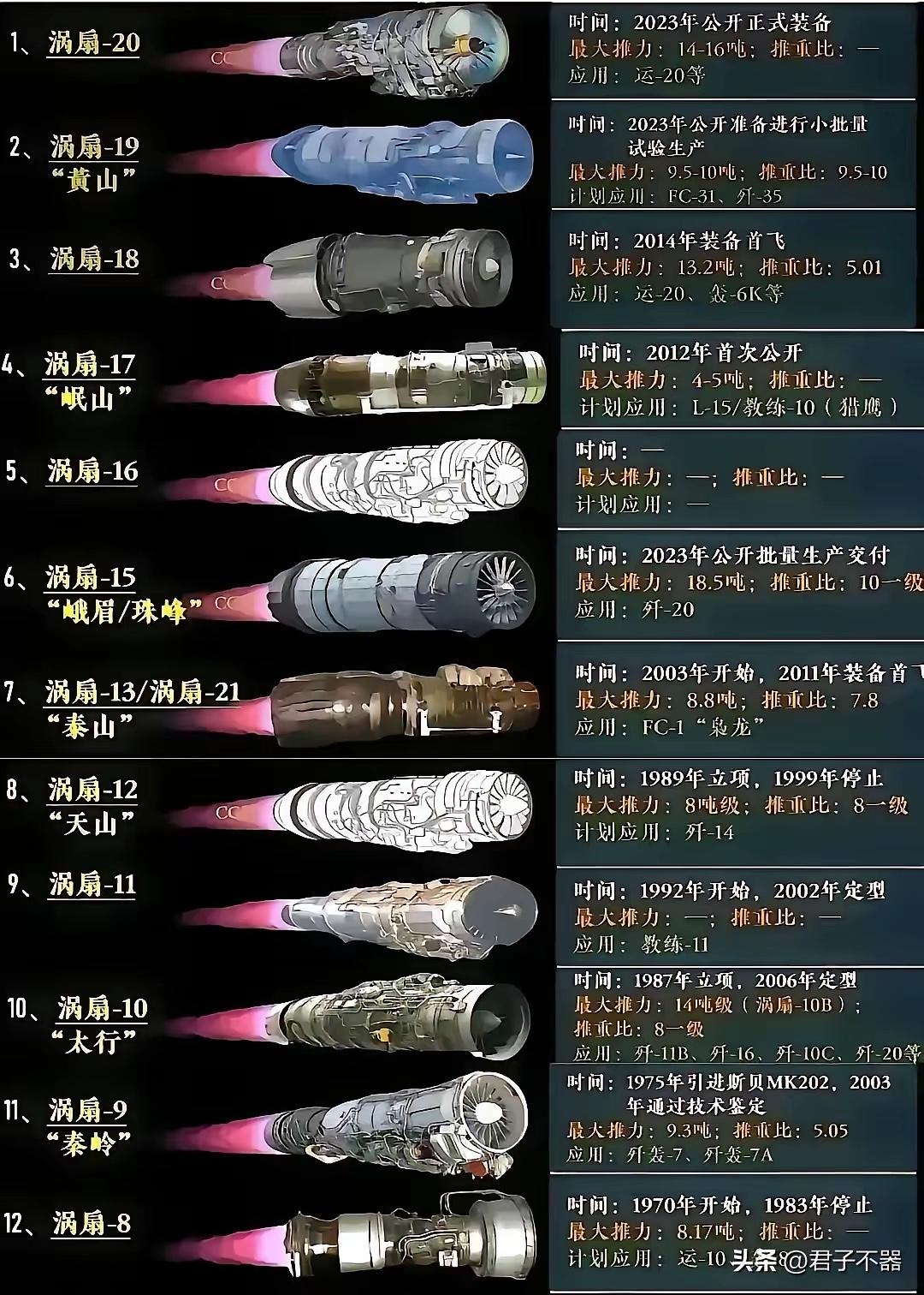 看到这么多款涡扇发动机,就一个感觉“发动机好才能战机好”。 涡扇-15“峨眉/珠峰”的最大推力达18.5吨,应用在歼-20上,而运-20的“涡扇-20”发动机最大推力才14-16吨。 如果把涡扇-15用在运-20上,那运-20的载重量还要往上翻!啥时候我们也能爆出一款像美国的C-5“银河”运输机或者“安-225”一类的运输机来,期待ing。