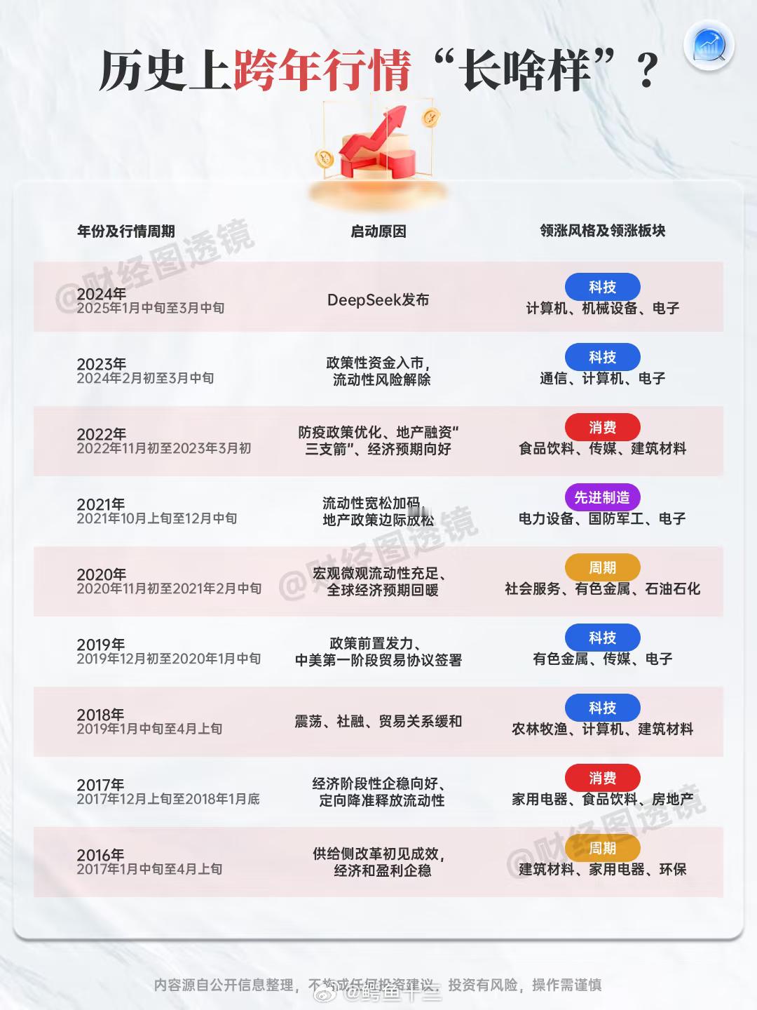 a股A股历年的跨年行情中可以总结出一些规律: 启动时点上,多位于11月至次年1月,基本在春节前启 动。 催化因素上, 大体可以分为三类, 并且行情触发因素不 同,会导致占优风格有所差别: 牛市一定要抓住新主线,最新解读跟踪新主线 3班我的投资新书《量价狙击》在清华大学出版上市了,购买地址:网页链接1|若是由于经济基本面向好,年末增长预期进一步强化 而催化的行情, 顺周期风格有望占优,如2016年、 2020年; 2|若是由于宏观政策超预期甚至出现反转催化,政策受 益方向或者得益于风险偏好改善的高弹性板块表现更 好,典型的如2018年、2022年; 3|若是由于前期风险扰动缓和、流动性宽松等因素催 化,占优风格多为具备景气优势或有产业趋势的方向, 典型的如2017年、2019年、2021年、2023-2024年。