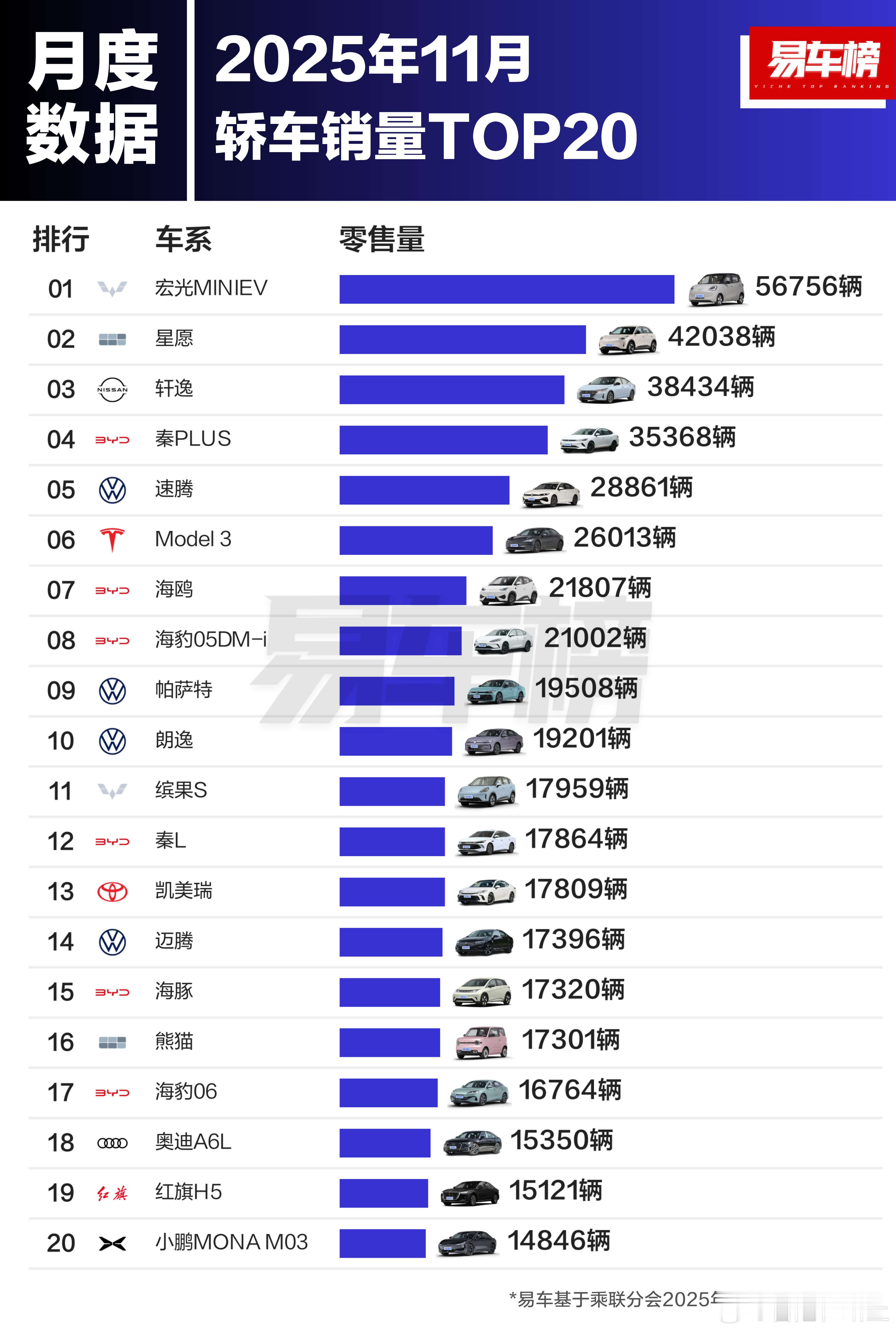 11月轿车/SUV/MPV销量TOP20大家参考一下 也就是个参考数据这方面一直都出口不一 没法精准大v聊车