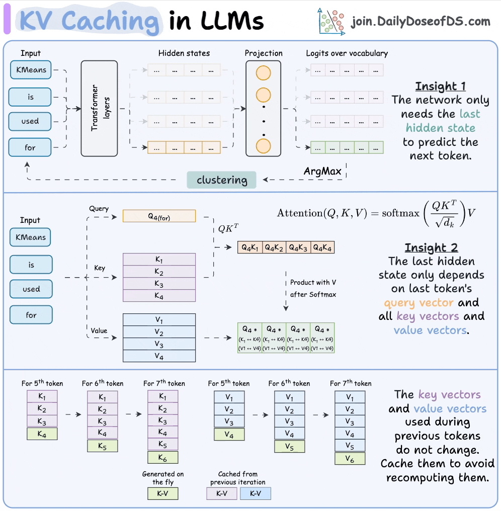 一张图看大模型里 KV Caching 的原理。制图:Daily Dose of Data Science网站 ( join.dailydoseofds.com/ )通过用“空间换时间”的方式(占用更多显存来存储 K 和 V 矩阵),避免了在每生成一个新字时重复计算历史信息的巨大算力浪费,从而让 AI 说话速度变快。