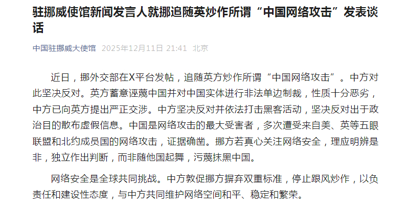 #中方回应挪追随英炒作所谓中国网络攻击# 【驻挪威使馆新闻发言人就挪追随英炒作所谓“中国网络攻击”发表谈话】#挪追随英炒作所谓中国网络攻击# 近日,挪外交部在X平台发帖,追随英方炒作所谓“中国网络攻击”。中方对此坚决反对。英方蓄意诬蔑中国并对中国实体进行非法单边制裁,性质十分恶劣,中方已向英方提出严正交涉。中方坚决反对并依法打击黑客活动,坚决反对出于政治目的散布虚假信息。中国是网络攻击的最大受害者,多次遭受来自美、英等五眼联盟和北约成员国的网络攻击,证据确凿。挪方若真心关注网络安全,理应明辨是非,独立作出判断,而非随他国起舞,污蔑抹黑中国。网络安全是全球共同挑战。中方敦促挪方摒弃双重标准,停止跟风炒作,以负责任和建设性态度,与中方共同维护网络空间和平、稳定和繁荣。网页链接