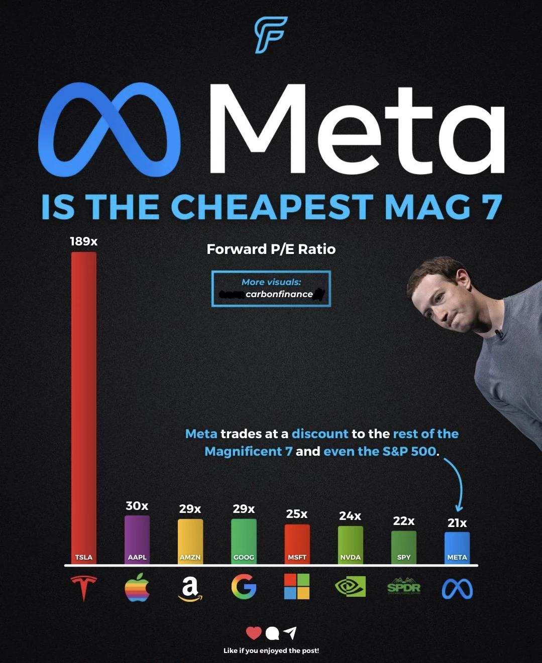 📊 图片重点展示了“美股七巨头(Magnificent 7)”的未来市盈率对比,从图中可以看到 Meta 的估值在七巨头中最低,甚至低于代表大盘的 S&P500 指数。这一数据让人重新审视 Meta 在科技巨头阵营中的位置和被低估的潜力。