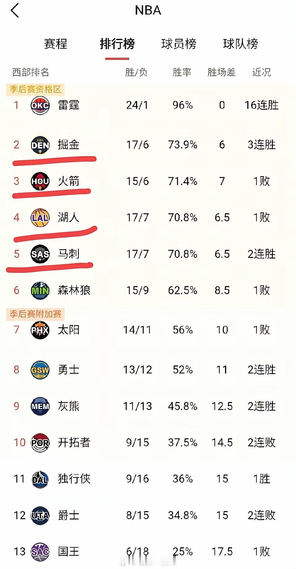 西部第二位置不好坐啊。今天nba杯淘汰赛湖人输给马刺,被淘汰出局,不但拿不到奖金,与杯赛冠军无缘,在排名上也下滑不少,被今天没有比赛的掘金和火箭反超,从西部第二,直接下滑到西部第四,胜率也被马刺追平。本赛季掘金、湖人和火箭都排在西部第二过,但都没坐稳,你方唱罢我登场,唯有雷霆傲视群雄,眼看着差距越拉越大。