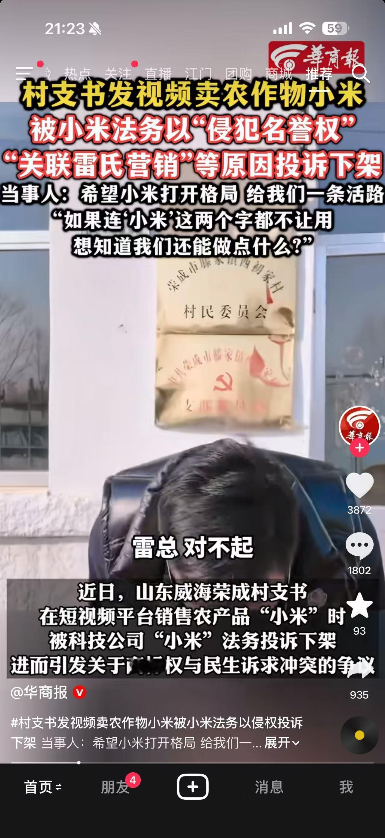刚刚刷到这个山东村支书卖小米被小米投诉的视频,光看见道歉了,没看见被下架的视频啥样。看那个投诉的理由也明白了,感觉应该不只是说小米这么简单。蹲一个后续,如果有涉嫌蹭人家热度,被投诉不亏。