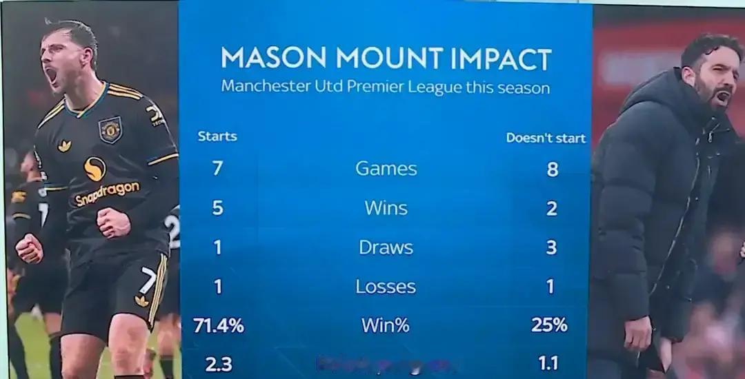 有芒特和没芒特的曼联,真不是一回事。 本赛季他首发7场,曼联拿了5胜1平1负。没让他首发的比赛,胜率才25%。 为啥这么大差别?他能覆盖左半扇,啥都会点——传球带球突破都有。最重要的是,他在左前腰位置站着,B费就能去中路。 B费本来就适合中路自由人,踢左边根本不行。之前滕哈赫试过让他踢左前腰或者左边路,效果都拉胯。 这差距不是一点点,肉眼可见的大。