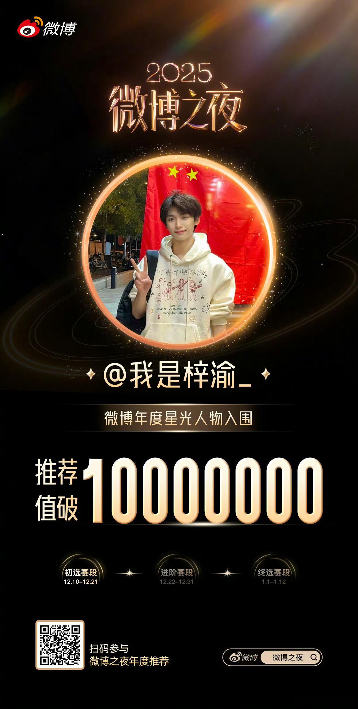 梓渝星光人物初选赛推荐值破万1000万恭喜在微博年度星光人物 初选段评选中,推荐值突破1000万!一键参与【微博年度星光人物】助TA登上荣誉之巅!微博之夜