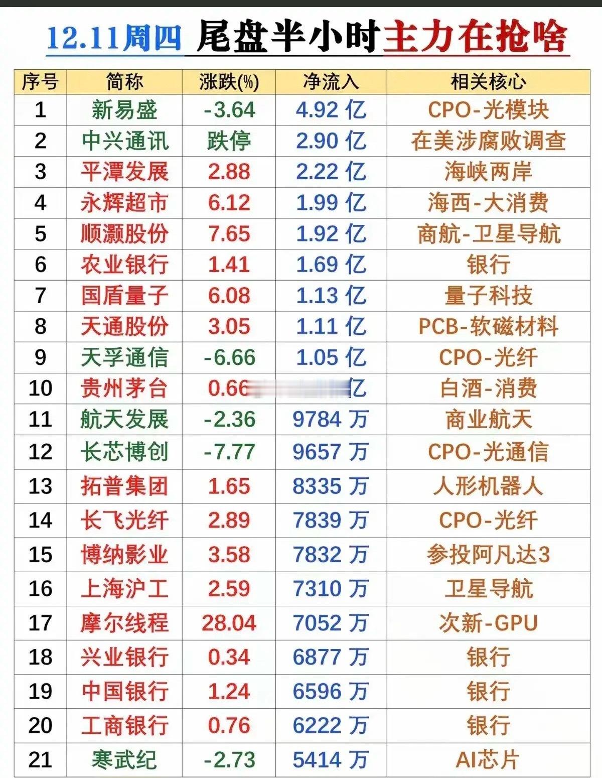 12月11日尾盘半小时资金抢筹个股梳理!1. 新易盛:尾盘净流入4.92亿居首,股价却跌3.64%,核心逻辑是CPO-光模块赛道龙头。资金借股价下跌大幅抄底,看好光模块在算力基建中的需求支撑,尾盘抄底动作凸显对其长期价值的认可,是科技主线的核心抄底标的。2. 中兴通讯:尾盘净流入2.90亿,股价跌停,因涉及在美涉腐败调查事件引发股价异动。主力资金在跌停板上逆势流入,或看好事件落地后的修复预期,也反映出资金对通信龙头的博弈心态。3. 平潭发展:尾盘净流入2.22亿,股价涨2.88%,主打海峡两岸题材。尾盘资金抢筹该标的,依托地域题材的短线热度,虽涨幅有限,但资金布局体现对海峡两岸支线题材的短期关注。4. 永辉超市:尾盘净流入1.99亿,股价涨6.12%,核心是海西-大消费主线。作为零售消费龙头,叠加海西地域属性,尾盘获资金加仓,反映资金对消费复苏及地域题材叠加标的的青睐。5. 顺灏股份:尾盘净流入1.92亿,股价涨7.65%,绑定商航-卫星导航题材。尾盘资金抢筹该标的,借商业航天主线热度布局,卫星导航作为航天细分赛道,获资金短期关注,推动股价上涨。6. 农业银行:尾盘净流入1.69亿,股价涨1.41%,属银行权重标的。尾盘资金布局该银行股,是典型的防御性配置,依托银行板块的低估值与稳定性,成为资金避险的核心选择之一。7. 国盾量子:尾盘净流入1.13亿,股价涨6.08%,主打量子科技题材。量子科技属前沿科技赛道,尾盘获资金加仓,反映资金对高端科技细分领域的挖掘,题材稀缺性推动股价上涨。8. 天通股份:尾盘净流入1.11亿,股价涨3.05%,核心是PCB-软磁材料。作为新材料标的,尾盘获资金布局,软磁材料在电子、半导体领域需求稳定,资金看好其产业价值,推动股价小幅上涨。9. 天孚通信:尾盘净流入1.05亿,股价跌6.66%,聚焦CPO-光纤赛道。资金借股价下跌抄底,CPO-光纤是光通信核心环节,与算力基建高度绑定,尾盘抄底体现对赛道的长期看好。10. 贵州茅台:尾盘净流入1.00亿,股价涨0.66%,属白酒-消费龙头。尾盘资金小幅加仓,依托白酒板块的消费属性与龙头稳定性,是资金防御配置的重要标的,同时也反映消费主线的资金分流。11. 航天发展:尾盘净流入9784万,股价跌2.36%,主打商业航天题材。作为商业航天主线标的,尾盘股价下跌时获资金抄底,体现资金对商业航天赛道的持续关注,看好其产业发展前景。12. 长芯博创:尾盘净流入9657万,股价跌7.77%,聚焦CPO-光通信赛道。资金借股价大跌抄底,光通信是算力基建的核心环节,尾盘抄底动作反映对该细分赛道的布局意愿,虽短期股价弱势但获资金认可。13. 拓普集团:尾盘净流入8335万,股价涨1.65%,主打人形机器人题材。人形机器人属新兴赛道,尾盘获资金布局,反映资金对高端制造细分题材的挖掘,虽涨幅有限但题材获短期关注。14. 长飞光纤:尾盘净流入7839万,股价涨2.89%,核心是CPO-光纤赛道。作为光纤领域龙头,尾盘获资金加仓,依托CPO主线热度,资金布局体现对光通信产业链的全面看好。15. 博纳影业:尾盘净流入7832万,股价涨3.58%,因参投《阿凡达3》获关注。影视传媒题材因热门影片上映获短期催化,尾盘资金抢筹该标的,借事件驱动进行短线布局。16. 上海沪工:尾盘净流入7310万,股价涨2.59%,主打卫星导航题材。卫星导航是商业航天的重要分支,尾盘获资金布局,依托航天主线的整体热度,成为细分赛道的资金布局标的。17. 摩尔线程:尾盘净流入7052万,股价涨28.04%,核心是次新-GPU题材。次新股叠加GPU稀缺题材,尾盘获资金爆炒,股价大幅上涨,成为短线资金追捧的热点标的,题材稀缺性是核心驱动。18. 兴业银行:尾盘净流入6877万,股价涨0.34%,属银行权重标的。尾盘资金布局该银行股,是防御性配置思路的体现,依托银行板块的低波动特征,成为资金避险的选择。19. 中国银行:尾盘净流入6596万,股价涨1.24%,属银行权重标的。尾盘获资金加仓,与农业银行、兴业银行形成联动,是资金扎堆布局银行板块、进行防御配置的典型体现。总结本次尾盘资金布局清晰呈现“攻科技、守银行消费”的思路:CPO-光模块、商业航天等科技主线是进攻核心,即便部分科技股下跌仍获抄底,反映资金对科技赛道的长期信心;银行权重与消费龙头则成为防御配置的主要方向,承接避险资金;次新+GPU等稀缺题材偶发炒作,而事件驱动型标的则出现资金博弈,整体尾盘资金布局兼顾了赛道成长与板块防御。本文涉及资讯、数据等内容来自网络公共信息,仅供参考,不构成投资建议!