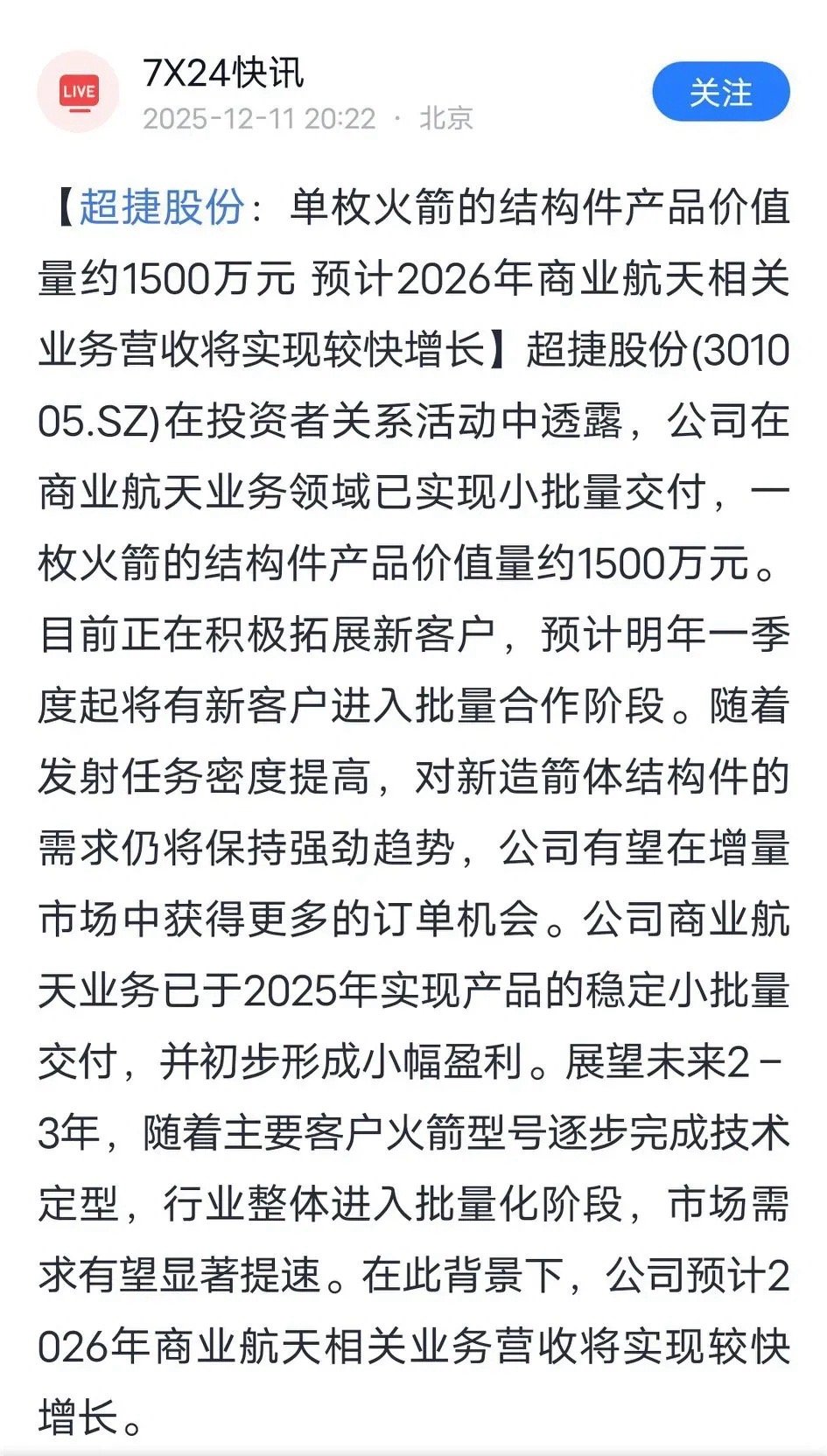 超捷股份调研内容:单枚火箭的结构件产品价值量约1500万元。超捷厉害了,还真不是讲故事,而是有业绩有单。厉害了,明年业绩爆了,商业航天最正宗的一家。重点:目前商业航天火箭箭体结构件领域,国内上市公司中无其它对标公司。也就是说是全市唯一的核心标的,稀缺性打满了,就看量化今晚怎么抓核心语料。