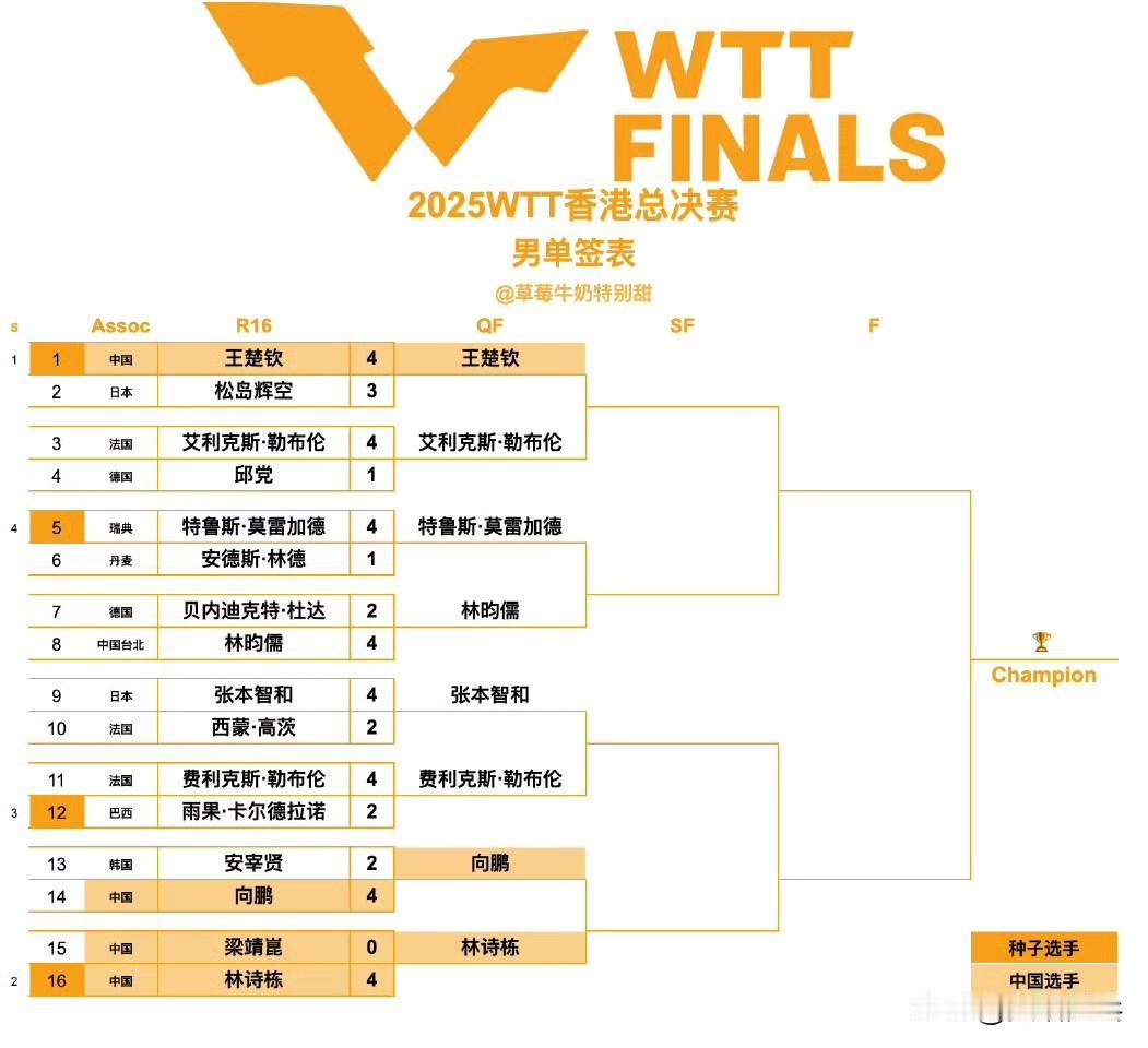 男单8强全部产生,1/4决赛名单公布! WTT香港总决赛2025 男单1/4决赛:12.11 1.王楚钦🇨🇳VS艾利克斯·勒布伦🇫🇷 2.特鲁斯·莫雷加德🇸🇪VS林昀儒(中国台北) 3.张本智和🇯🇵VS费利克斯·勒布伦🇫🇷 4.向鹏🇨🇳VS林诗栋🇨🇳