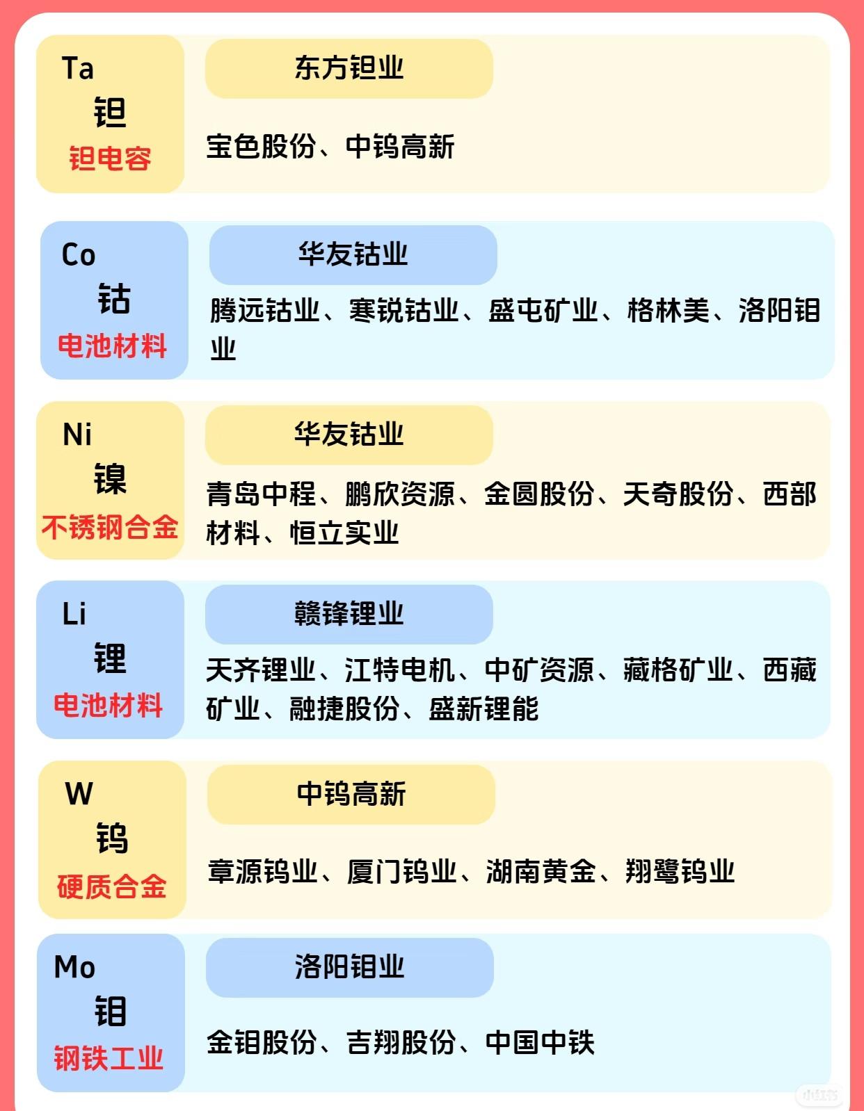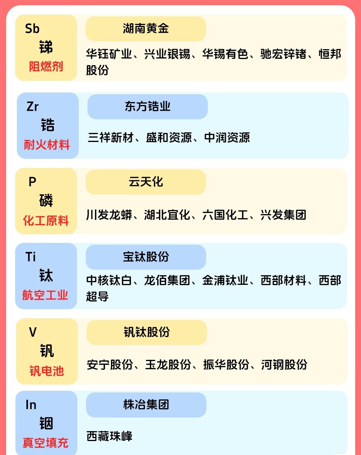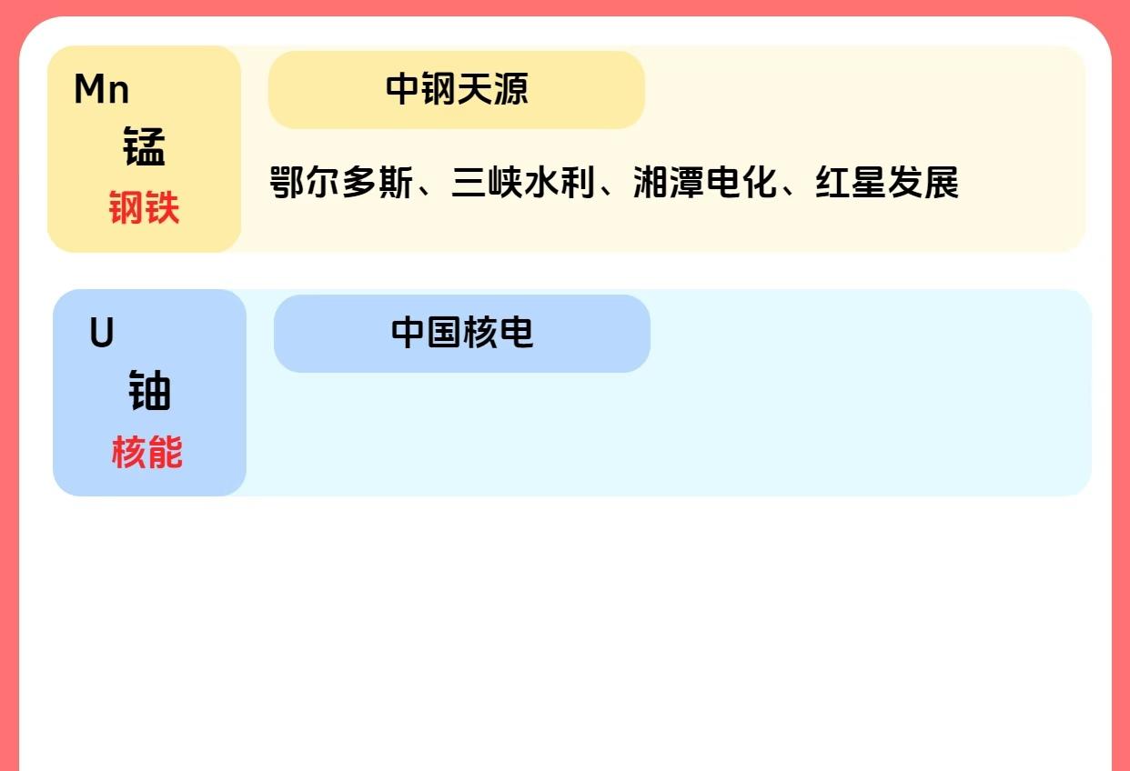 A股市场贵金属及相关金属产业链的主要上市公司及行业龙头情况如下: 第一张图聚焦贵金属领域,按金属种类分类列出18种贵金属相关的上市公司及龙头。其中,黄金(Au)类有紫金矿业、赤峰黄金等10家公司,龙头为紫金矿业、赤峰黄金;铜(Cu)类包括北方铜业、江西铜业等9家,龙头为北方铜业、江西铜业;铝(Al)类有中国铝业、银邦股份等11家,龙头为中国铝业;锡(Sn)类含锡业股份、华锡有色等3家,龙头为锡业股份,另特别提及“钽电容”(锡相关应用)。 第二张图扩展至更多金属元素及其应用领域,覆盖钽、钴、镍、锂、钨、钼等。钽(Ta)主要用于钽电容,核心企业为东方钽业,相关企业包括宝色股份、中钨高新;钴(Co)用于电池材料,龙头为华友钴业,相关企业有腾远钴业、寒锐钴业等;镍(Ni)应用于不锈钢合金,华友钴业为核心,涉及青岛中程、鹏欣资源等;锂(Li)用于锂电池材料,龙头为赣锋锂业,相关企业含天齐锂业、江特电机等;钨(W)用于硬质合金,龙头为中钨高新,相关企业有章源钨业、厦门钨业等;钼(Mo)用于钢铁工业,龙头为洛阳钼业,相关企业包括金钼股份、吉翔股份等。 第三张图进一步补充其他金属的用途及关联企业:锑(Sb)用于阻燃剂,涉及湖南黄金、华钰矿业等;锆(Zr)用作耐火材料,核心企业为东方锆业,相关企业有三祥新材、盛和资源等;磷(P)作为化工原料,龙头为云天化,相关企业含川发龙蟒、湖北宜化等;钛(Ti)应用于航空工业,核心为宝钛股份,相关企业有中核钛白、龙佰集团等;钒(V)与钒电池相关,龙头为钒钛股份,涉及安宁股份、玉龙股份等;铟(In)用于真空填充,关联企业为株冶集团、西藏珠峰。 第四张图则聚焦锰和铀两类元素:锰(Mn)用于钢铁工业,核心企业为中钢天源,相关企业包括鄂尔多斯、三峡水利等;铀(U)应用于核能领域,核心为中国核电。 整体来看,以上系统梳理了A股市场中贵金属及多种战略金属的分类、应用领域、核心龙头企业及相关企业,覆盖了从传统贵金属到新能源、高端制造等领域的关键金属产业链,信息清晰且便于快速查阅。