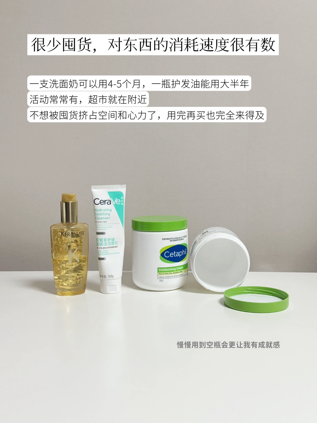 一支洗面奶可以用4-5个月,一瓶护发油能用半年以上。活动常常有,超市就在附近,不想再被囤货挤占空间和心力了,快用完再买也完全来得及
