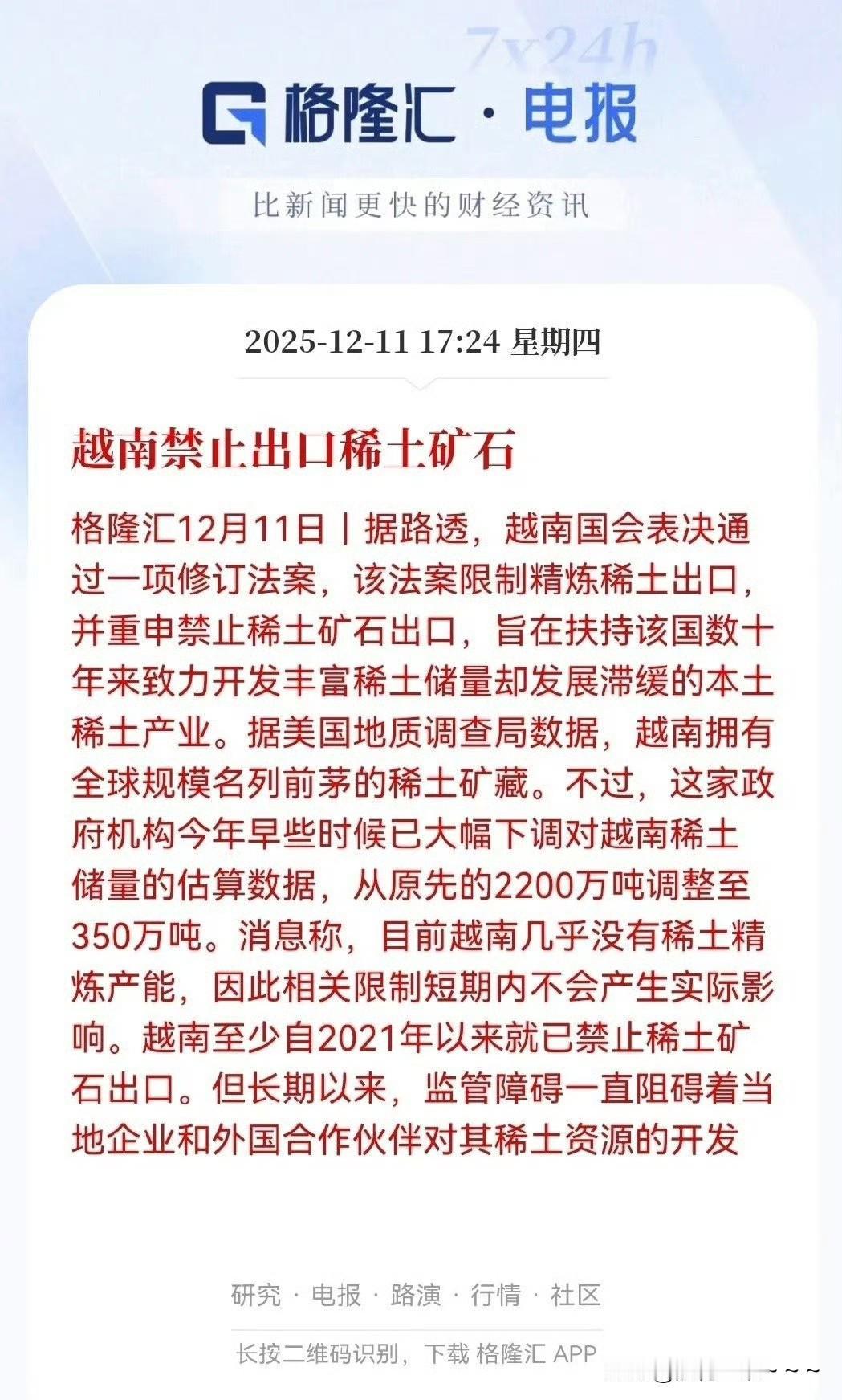 一个不起眼的新闻! 就在今天,越南通过了一个法案,接下来要禁止出口稀土矿石!据悉,该法案实施是从2026年1月1日起。 资料显示,越南的稀土储存量在世界上排名还是比较靠前的,之前都被认为排名第二,但是,现在也给排在了第六名! 当前,越南应该是看到了稀土的重要性,所以说,现在在原矿出口上进行了限制,目的应该是要大力发展自己的本土供应链,想立足自己,能够掌握稀土提炼的技术啊! 可以预见的是,一旦越南有了稀土的装备和技术,那么就可以实现越南的稀土的自主可控,还能对外卖个好价钱,他们应该是这么盘算的。[捂脸]