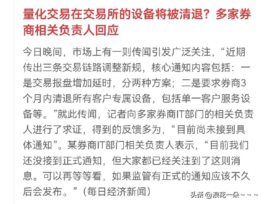股民们,大牛市要来了?[捂脸] 这意思是量化交易要取消吗?[笑哭]如果量化交易在交易所的设备都被清退了,设备没了,那么,不就是不能在设备上进行量化交易了吗?简而言之就没有量化交易了嘛!哎!好拗口,是这个意思吗?老铁们! 如果机构都没有量化交易了,那么散户的春天不就来了吗,因为机构和散户就能平等在市场操作了嘛!你们想想,那人能比得上机器吗?肯定比不上呀。所以,牛市也就有基础了!奥利给![捂脸] 这条新规是真是假静等官方通报为准吧,反正现在股市非常重要,在我看来容不得走熊。