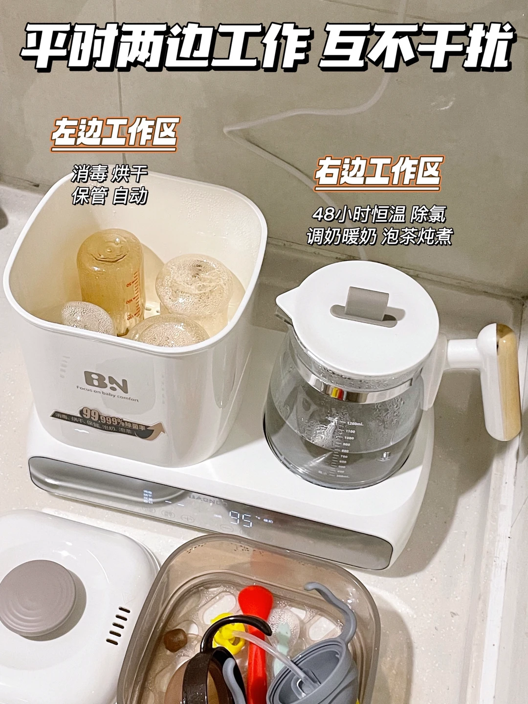 ▪️右边则是恒温壶,可以烧水又能除氯!温度都是设定好的,泡奶是45°,泡米粉是70°,煮水是100°,不用再去手动调温度,48小时恒温,夜里泡奶不要太方便!