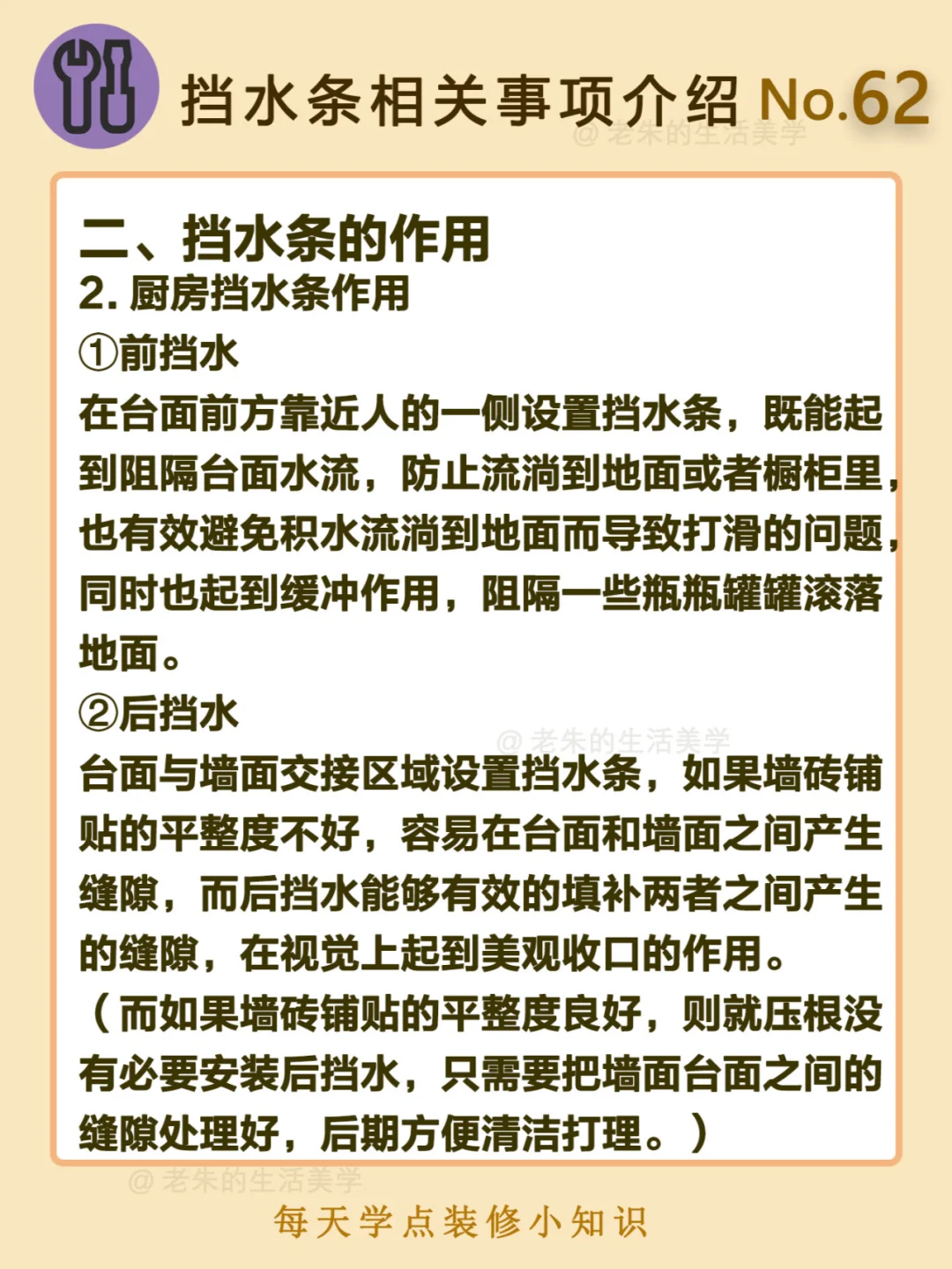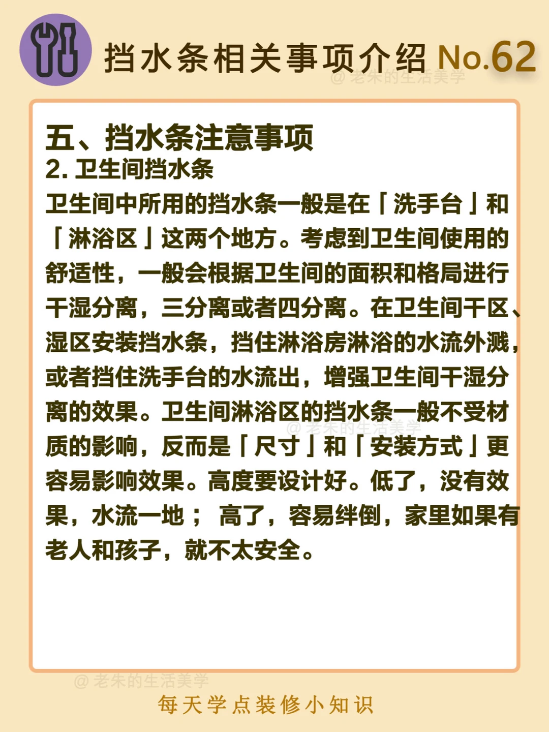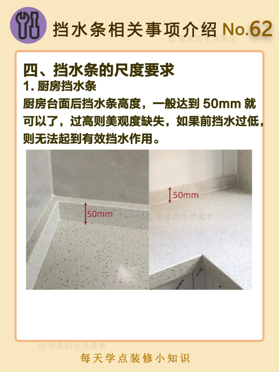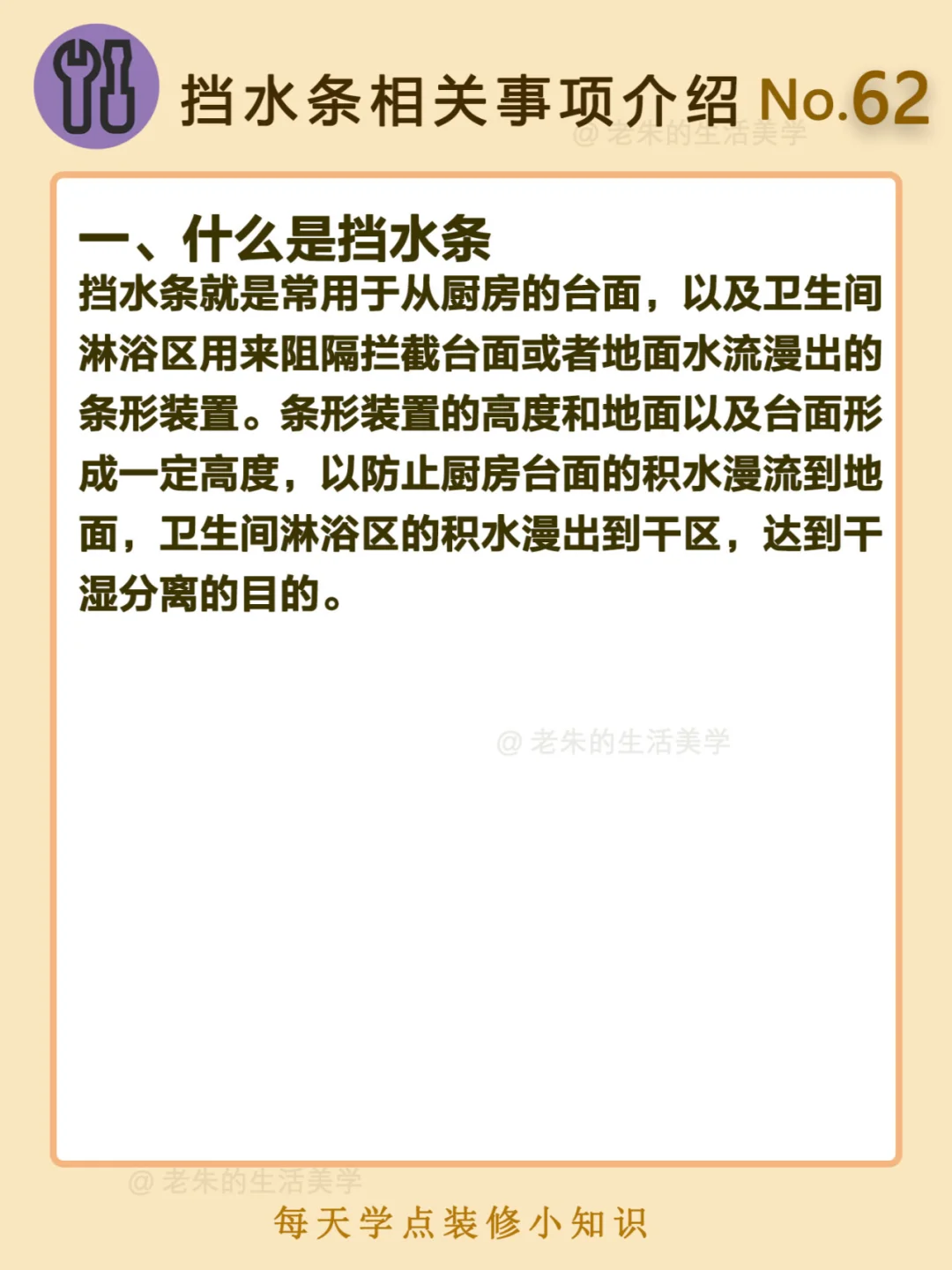 挡水条就是常用于从厨房的台面,以及卫生间淋浴区用来阻隔拦截台面或者地面水流漫出的条形装置。条形装置的高度和地面以及台面形成一定高度,以防止厨房台面的积水漫流到地面,卫生间淋浴区的积水漫出到干区,达到干湿分离的目的。
