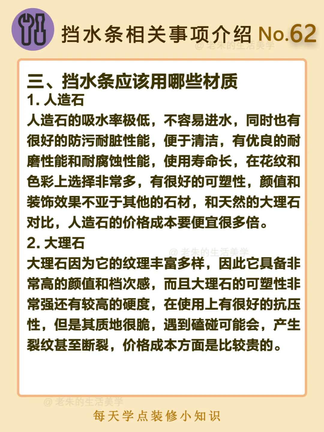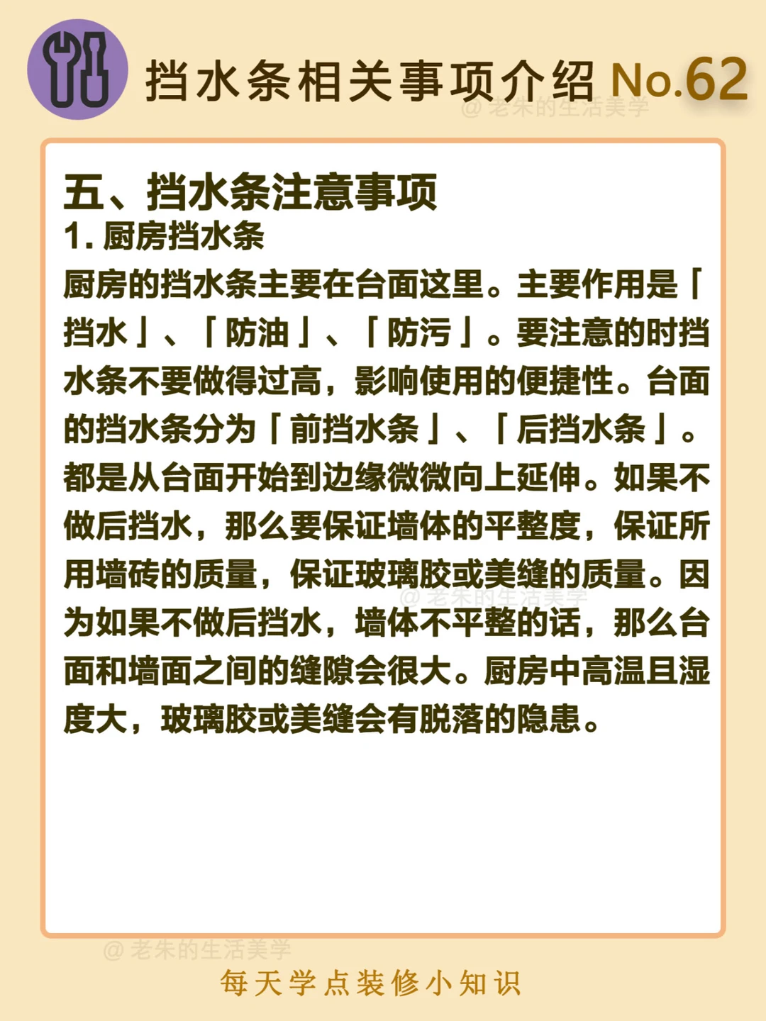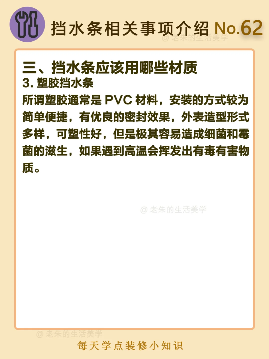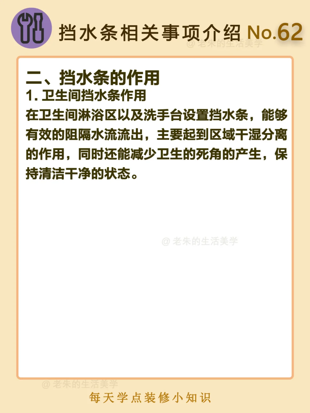 挡水条就是常用于从厨房的台面,以及卫生间淋浴区用来阻隔拦截台面或者地面水流漫出的条形装置。条形装置的高度和地面以及台面形成一定高度,以防止厨房台面的积水漫流到地面,卫生间淋浴区的积水漫出到干区,达到干湿分离的目的。