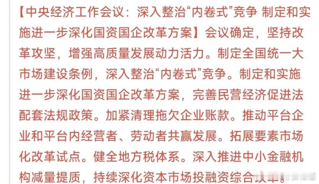 会议来重磅利好了,明天A股的行情基本稳了会议提出,整治“内卷式”竞争,这次的对象是国企国企一直都是A股公司里面最大的权重,先前的“反内卷”浪潮里面一直没有提国企,一直都是以光伏,钢铁这些行业来制定的政策。这次明确把国企也加入了进去。基本上大金融和中字头里面的权重都是国企,这次改革将会对于国企这些公司有一个业绩提升的预期,明天很可能能够拯救一下现在的股市。2025年国企改革板块仅仅涨了7.41%,远远低于今天A股其他板块的涨幅,有望在年底追赶一波。