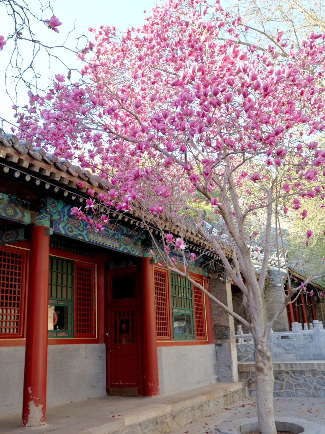 🌸紫玉兰:山门殿,与红色建筑在一起,古韵十足