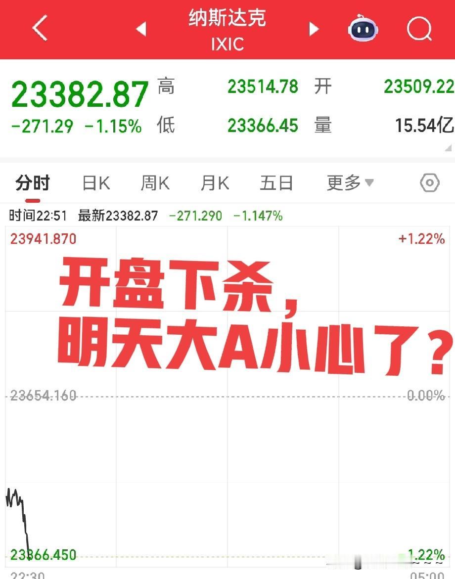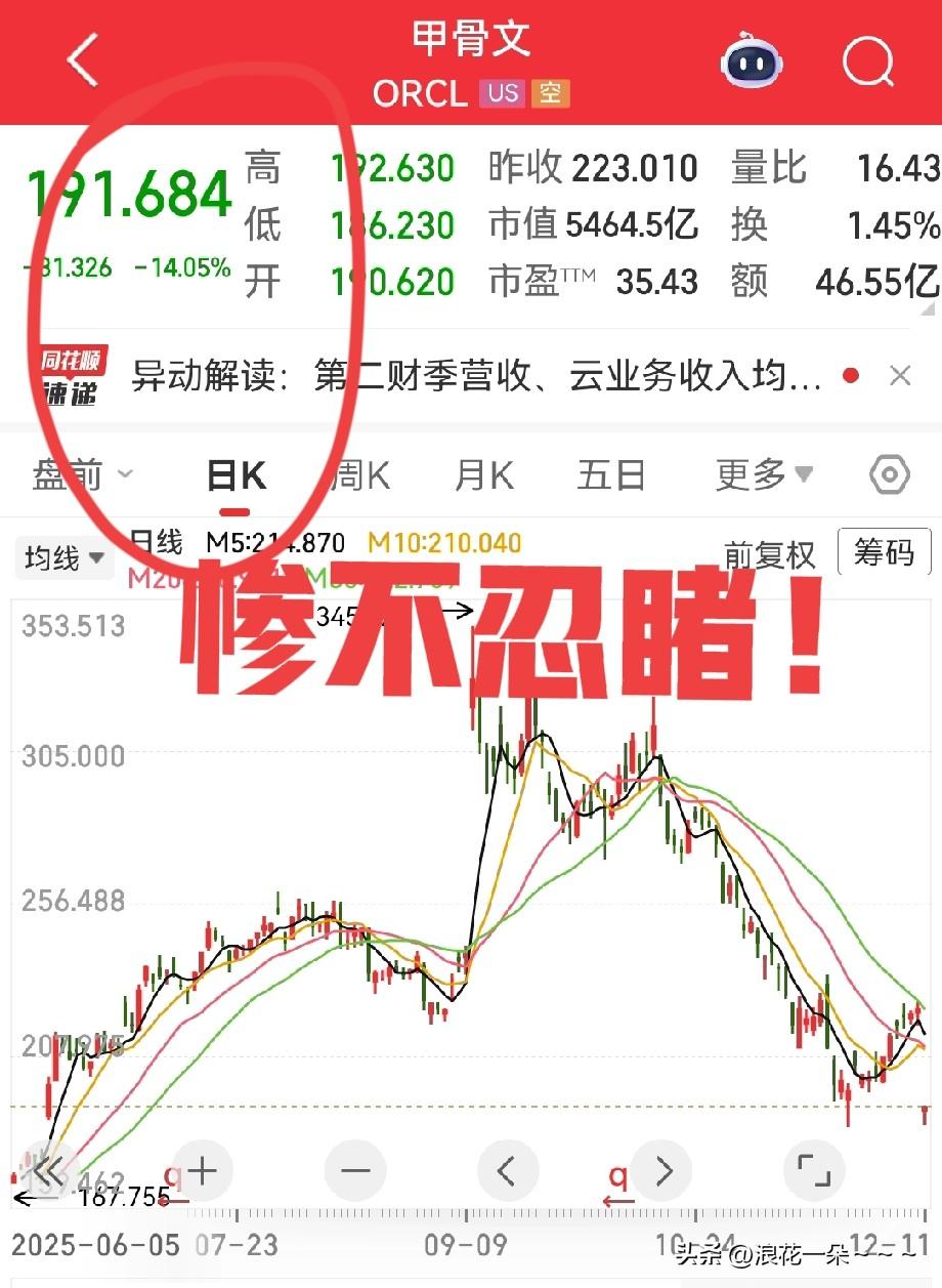 夜已经很深, 都钻到自己的小被窝了吗?赶紧看看美股吧,低开下杀!甲骨文这个大科技股崩了?截止我发文已经大跌14%,为啥大跌?当然是跟甲骨文的业绩有关,业绩非常差。 从这一点我们可以看出,美股有的科技股也是天天在吹牛,在吹泡沫,也难怪有的机构在做空美国的AI。 当然我们也要仔细想想,既然美联储到刚刚降息,本来对美股是利好的,那么为什么纳斯达克已经开盘就下杀了1.3%呢?在我看来,还是美股涨的太多了,已经没有动力上涨了,降息信心给的不是很足,反而是因为经济差才降息。 如果今天晚上美股收盘大跌的话,那么,对明天A股来说,可能承压比较大。 虽然今天A股个股也跌的比较厉害了,而且,今晚上还有会议的利好,但是,往往这个时候,机构可能会继续反人性操作,借利好和美股的下跌继续洗盘!总之,明天A股还是要谨慎为主。你们怎么看?祝你们发财啊。