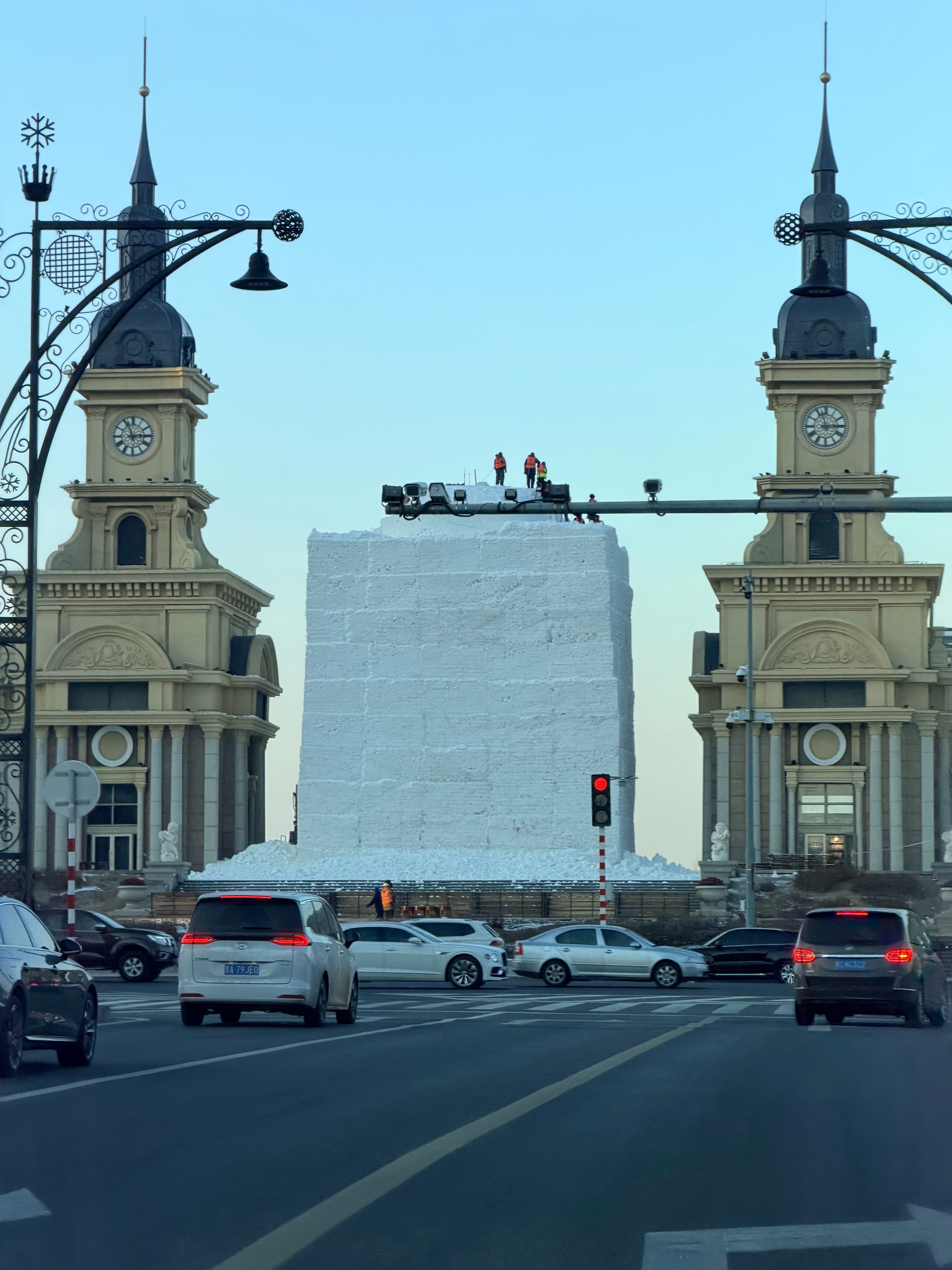哈尔滨大雪人就是在这个雪墩子上一榔头一榔头敲出来的吗?太牛了!打雪仗的时候,我想搓一个圆球都搓不出来。这得多少人,以什么样的方法,才能做成圆圆脑袋的大雪人啊?